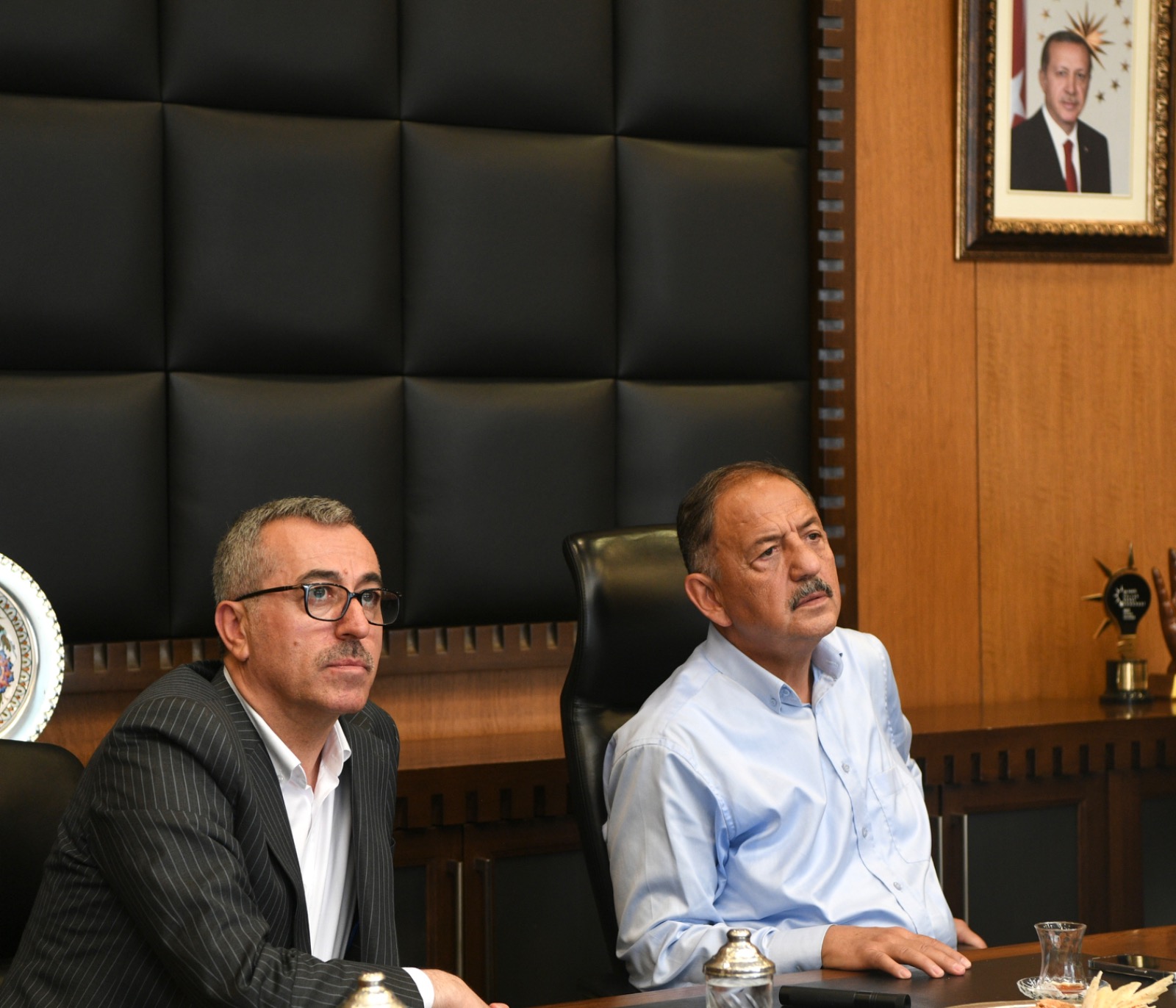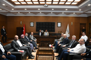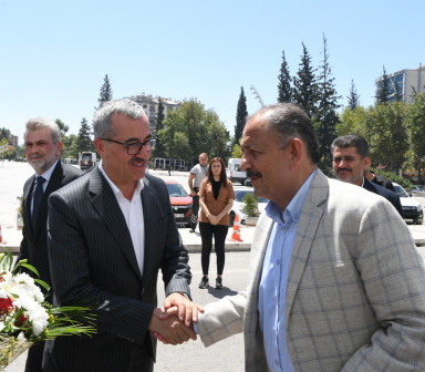 Kahramanmaraş Büyükşehir Belediye Başkanı Hayrettin Güngör, Kentsel Dönüşüm Toplu Temel Atma Töreni’ne katılmak ve bir dizi ziyarette bulunmak üzere şehre gelen Çevre, Şehircilik ve İklim Değişikliği Bakanı Mehmet Özhaseki’yi makamında ağırladı. TBMM Tarım, Orman ve Köyişleri Komisyonu Başkanı Prof. Dr. Vahit Kirişci, AK Parti Kahramanmaraş Milletvekilleri Ömer Oruç Bilal Debgici, Mevlüt Kurt, Dr. Tuba Köksal ve Prof. Dr. Mehmet Şahin, AK Parti İl Başkanı Fırat Görgel, ilçe belediye başkanları, Galatasaray Spor Kulübü Başkanı Dursun Özbek ve kurum yetkililerinin de yer aldığı programda Başkan Hayrettin Güngör, Bakan Özhaseki ve beraberindeki heyete şehirde yürütülen çalışmalara ilişkin son bilgileri aktardı.