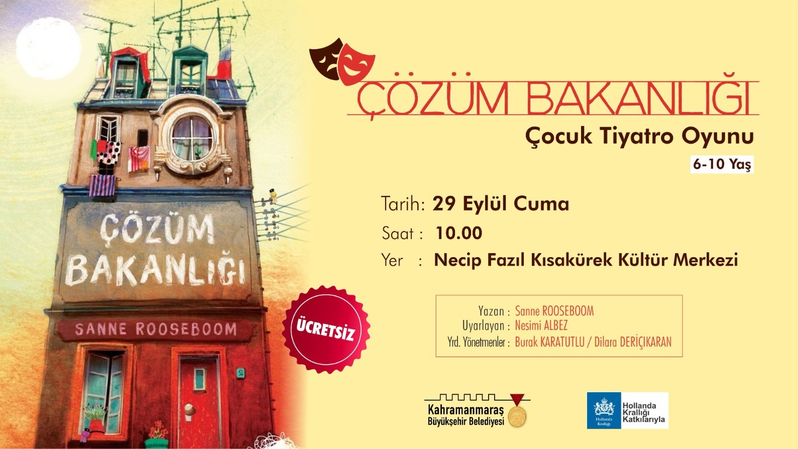 Büyükşehir Belediyesi ve Hollanda Büyükelçiliği iş birliğiyle hayata geçirilen proje kapsamında ‘Çözüm Bakanlığı’ adlı tiyatro gösterisi, 29 Eylül Cuma günü NFK Kültür Merkezi’nde çocuklarla buluşacak.