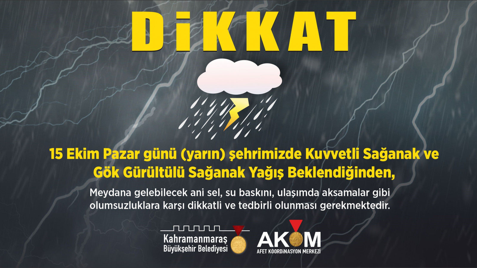 Büyükşehir Belediyesi Afet Koordinasyon Merkezi (AKOM), 15 Ekim Pazar günü (yarın) Kahramanmaraş’ta kuvvetli sağanak ve gök gürültülü sağanak yağış beklendiğini duyurdu.