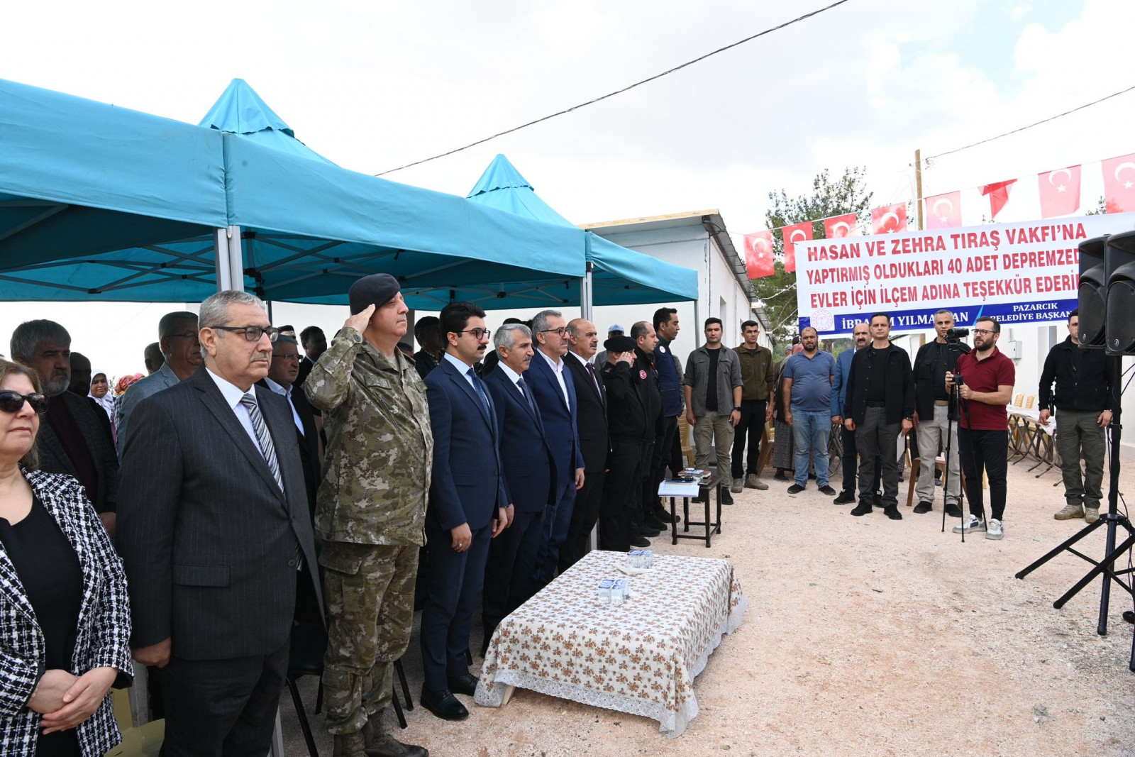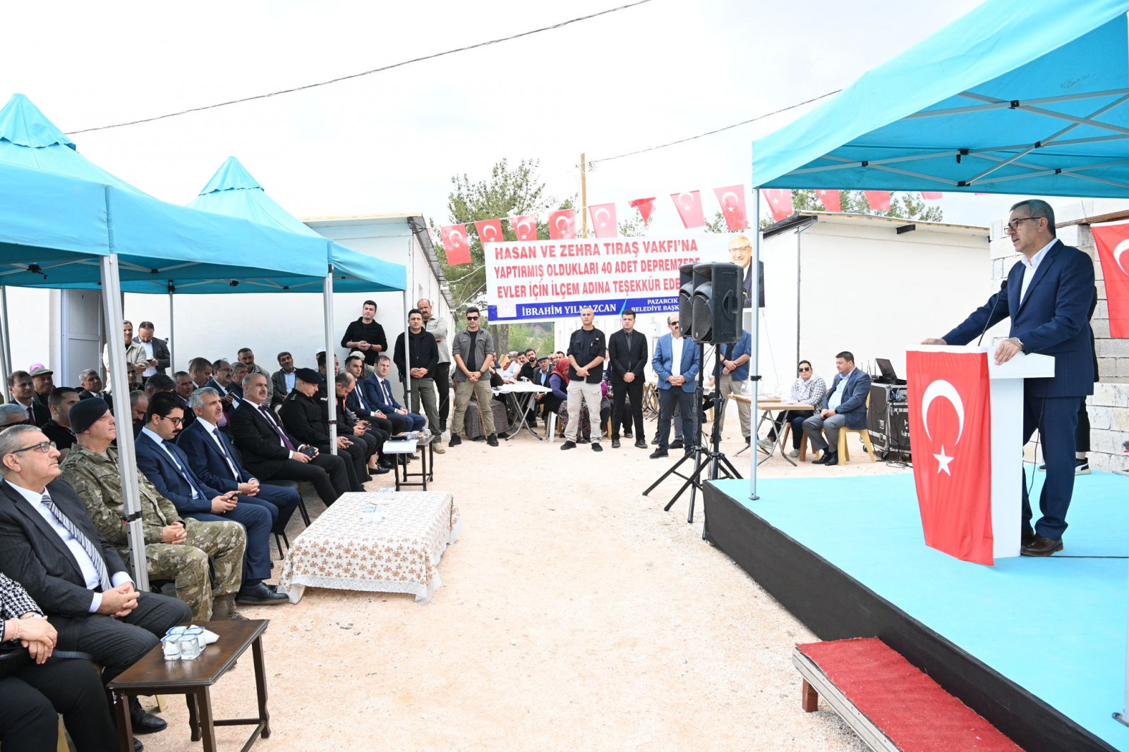 Pazarcık Belediye Başkanı İbrahim Yılmazcan programda yaptığı konuşmada, “Deprem sonrası hızlı bir aksiyon alarak vatandaşlarımız için geçici barınma merkezleri oluşturan devletimiz, kalıcı konutları da hızlı bir şekilde inşa ediyor. Bu süreçte bizlerin yanında olan herkese teşekkür ediyorum. Bugün de Zehra ve Hasan Tıraş Vakfı tarafından oluşturulan 40 depremzede evinin anahtar teslimi için bir aradayız. Vakıf yöneticilerimize şükranlarımızı sunuyoruz” cümlelerini kaydetti.