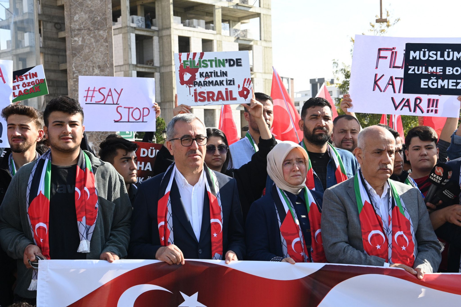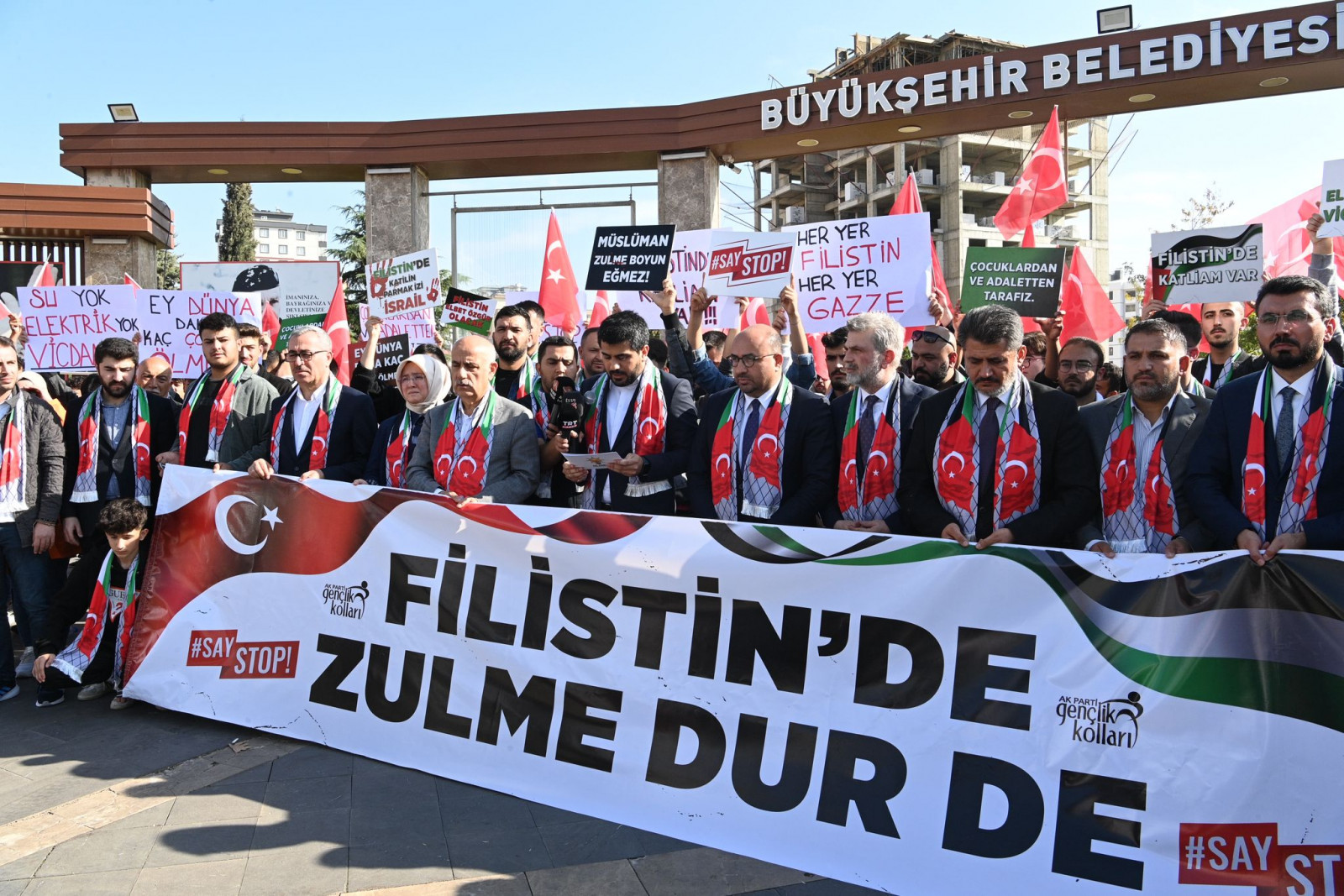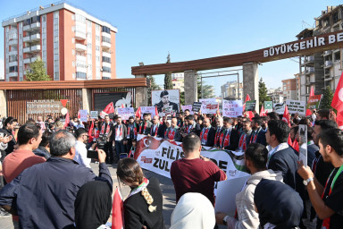 Programda konuşan AK Parti Kahramanmaraş Gençlik Kolları Başkanı Feyzullah Eren Aşçı, “Akan onca masum kana, dökülen gözyaşlarına seyirci kalamayan, mazlum ve mağdur coğrafyalar için her fırsatta hak ve hakikati haykıran AK Parti Kahramanmaraş Gençlik Kolları Başkanlığı olarak ‘SayStop’ demek üzere bugün bir araya geldik. 1948 yılından bu yana devam eden çatışmaların kronikleşmiş bir hal aldığı Filistin’de katil İsrail 7 Ekim’den bugüne küresel vicdanı derinden yaralayan, çok sayıda can kaybının yaşandığı yeni bir çatışma ortamı oluşturmuştur. Her karış toprağının yoğun bombardımana tabi tutulduğu, orantısız gücün, savaşlarda dahi kullanımı yasak olan mühimmatların kullanıldığı, insan haklarının hiçe sayıldığı, insanlık onurunun ayaklar altına alındığı Filistin’de İsrail tarihe adını bir kez daha kara lekeyle yazdırmıştır” cümlelerini kaydetti.