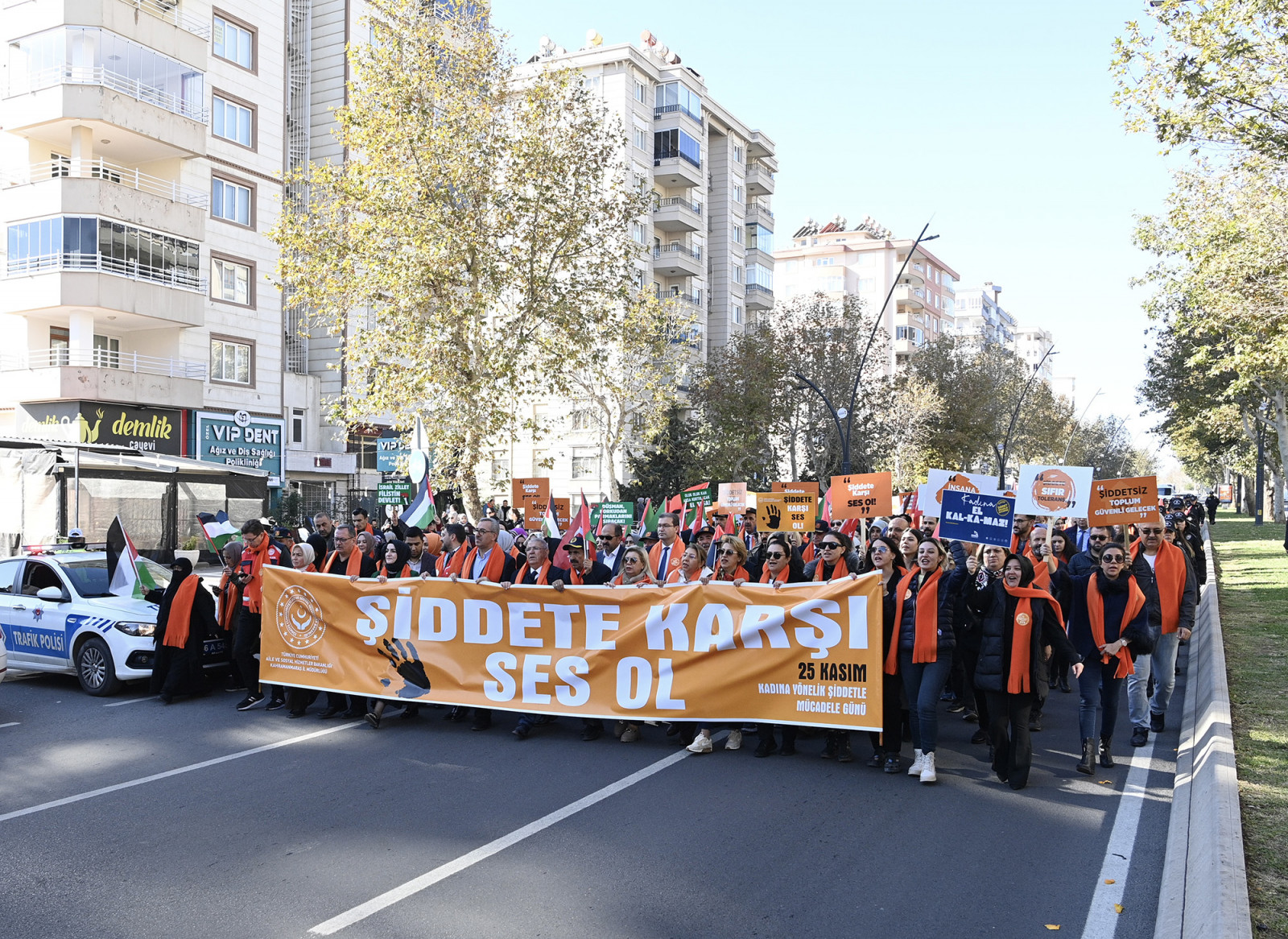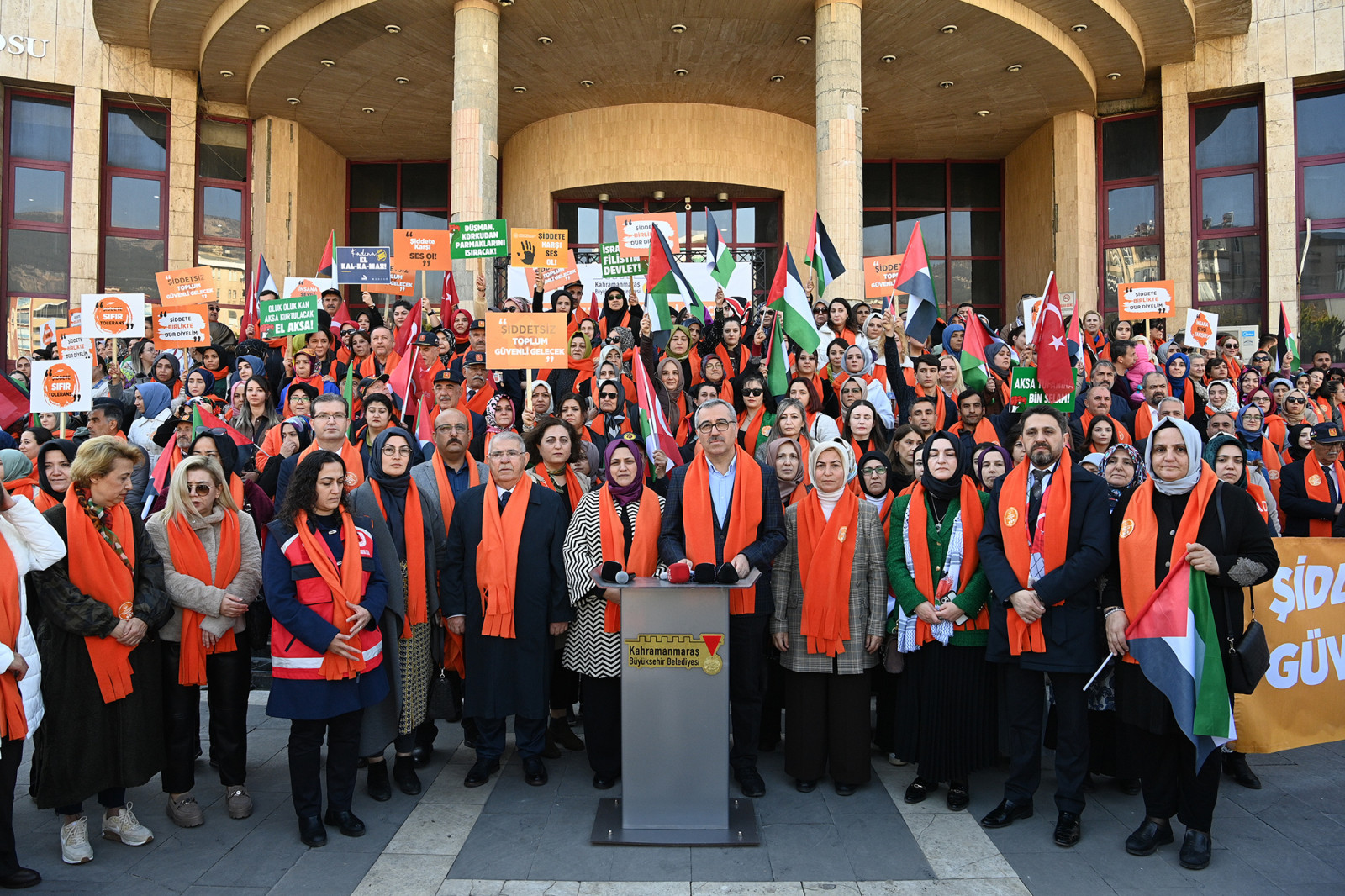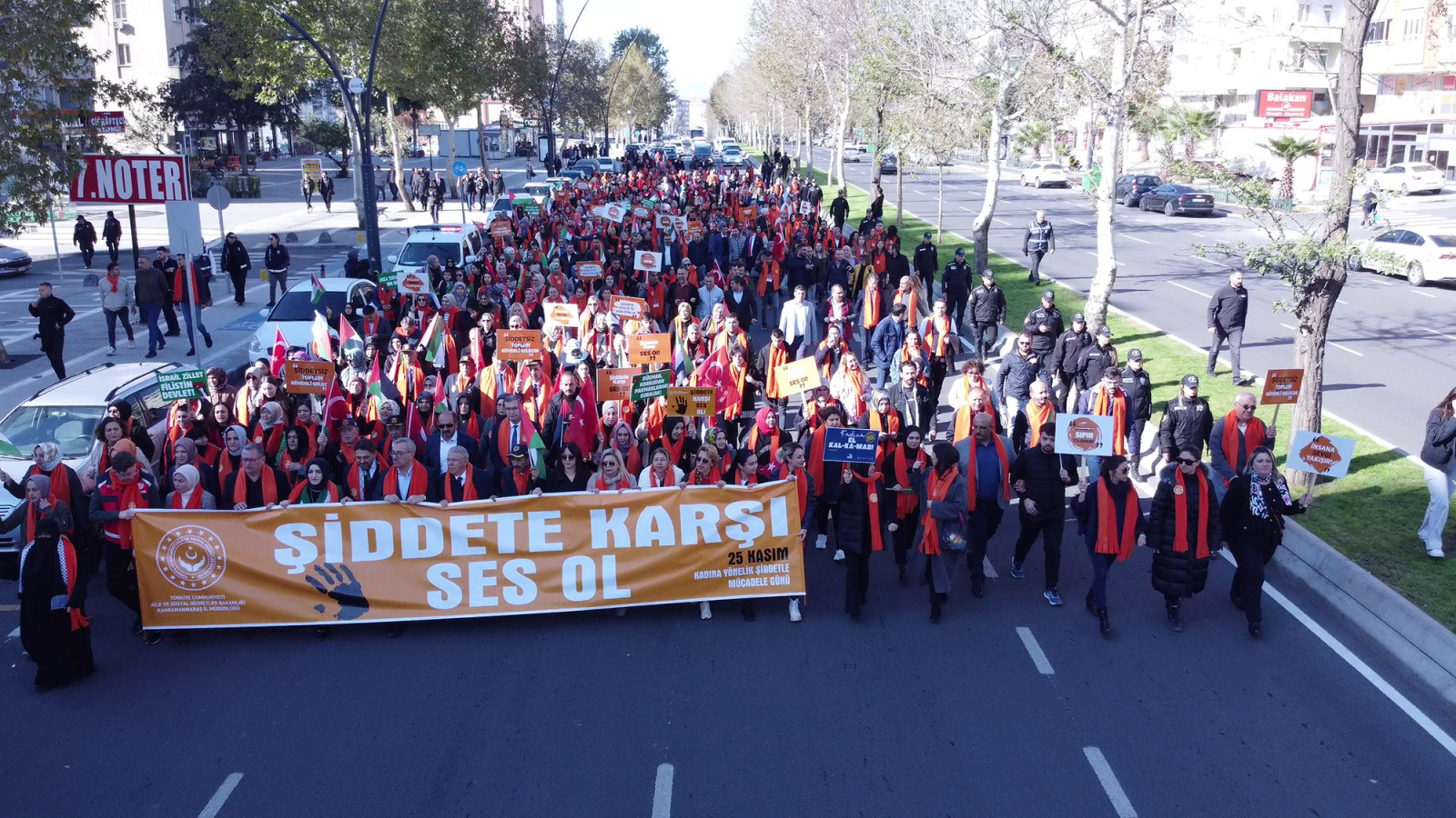 Sosyal belediyecilik çerçevesinde daima vatandaşın yanında olan, toplumsal olaylara sessiz kalmayan Kahramanmaraş Büyükşehir Belediyesi; Valilik, Aile ve Sosyal Hizmetler İl Müdürlüğü ve Kadın ve Demokrasi Derneği (KADEM) iş birliğiyle 25 Kasım Kadına Yönelik Şiddete Karşı Uluslararası Mücadele Günü dolayısıyla anlamlı bir programa ev sahipliği yaptı. Savaş mağduru Filistinli kadınlar özelinde şiddet gören tüm kadınlar için Alparslan Türkeş Bulvarı’nda ‘Şiddete Karşı Ses Ol’ temalı yürüyüş gerçekleştirildi. Büyükşehir Belediye Başkanı Hayrettin Güngör’ün yanı sıra, Onikişubat Belediye Başkanı Hanefi Mahçiçek, Aile ve Sosyal Hizmetler İl Müdürü Mutlu Kaya, İl Kültür ve Turizm Müdürü Seydihan Küçükdağlı, AK Parti İl Kadın Kolları Başkanı Asuman Yavuz, kadın STK temsilcileri ve yüzlerce vatandaşın da yer aldığı yürüyüşte, hep bir ağızdan ‘Kadına Şiddete Hayır’ sloganları atıldı. Aile ve Sosyal Hizmetler İl Müdürlüğünün önünden başlayan yürüyüş, Necip Fazıl Kısakürek Kültür Merkezi’nde noktalandı.