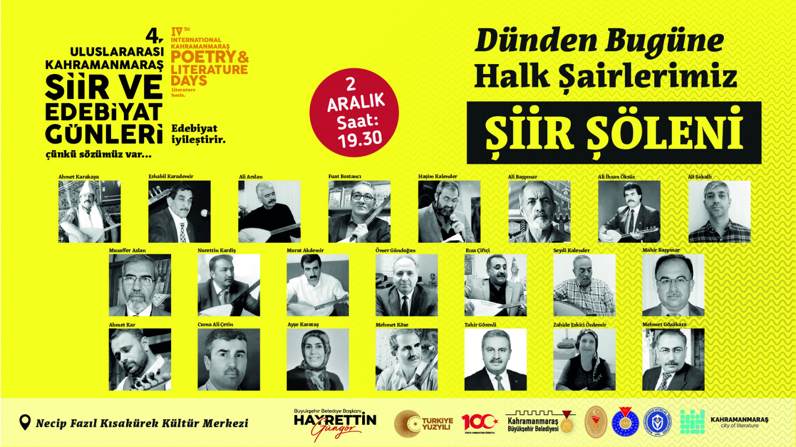Büyükşehir Belediyesi tarafından bu yıl 4’üncüsü gerçekleştirilecek Uluslararası Kahramanmaraş Şiir ve Edebiyat Günleri, 2 Aralık Cumartesi günü saat 19.00’da NFK Kültür Merkezi’nde gerçekleştirilecek konferans ve şiir şöleniyle başlayacak.
