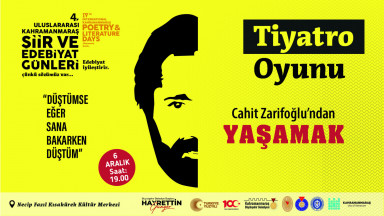 Uluslararası Kahramanmaraş Şiir ve Edebiyat Günleri kapsamında, 6 Aralık Çarşamba günü NFK Kültür Merkezi’nde il geneli şiir okuma yarışması finali ve Türk edebiyatının en önemli şahsiyetlerinden Cahit Zarifoğlu’nun hayatını konu alan ‘Yaşamak’ adlı tiyatro gösterisi düzenlenecek.