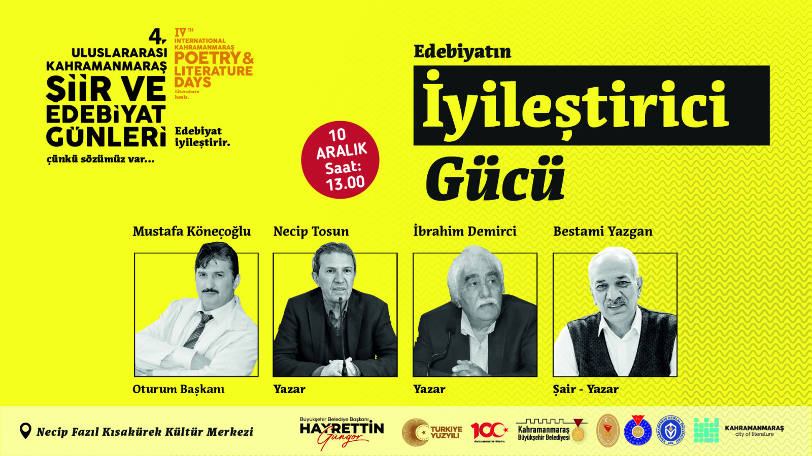 Kahramanmaraş Büyükşehir Belediyesinin ‘Edebiyat İyileştirir’ mottosuyla bu yıl 4’üncüsünü düzenlediği ve açıldığı günden itibaren binlerce edebiyatseveri ağırlayan Uluslararası Şiir ve Edebiyat Günleri, 10 Aralık Pazar günü gerçekleştirilecek programlarla noktalanacak. Uluslararası etkinliğin son gününde, Necip Fazıl Kısakürek Kültür Merkezi’nde Yazar Necip Tosun, İbrahim Demirci ve Bestami Yazgan’ın katılımıyla ‘Edebiyatın İyileştirici Gücü’ konulu panel düzenlenecek. Oturum Başkanlığını Şair – Yazar Mustafa Köneçoğlu’nun yapacağı program saat 13.00’da başlayacak. Saat 19.00’da ise 4. Uluslararası Kahramanmaraş Edebiyat Ödülleri Takdim Töreni gerçekleştirilecek. Sunuculuğunu İbrahim Sadri’nin yapacağı ve Yazar Prof. Dr. Kemal Sayar’ın onur konuğu olarak yer alacağı programda, çeşitli dallarda edebiyat ödülleri sahiplerini bulacak. Büyükşehir Belediyesinden yapılan açıklamada, 10 Aralık Pazar günü Necip Fazıl Kısakürek Kültür Merkezi’nde gerçekleştirilecek panel ve edebiyat ödülleri takdim törenine tüm edebiyatseverlerin davetli olduğu belirtildi.