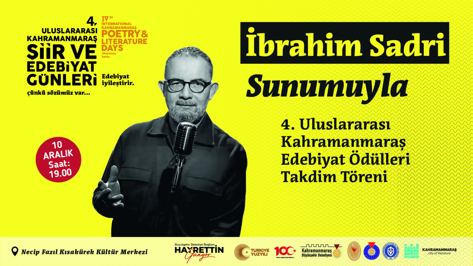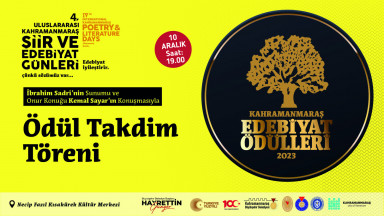 Büyükşehir Belediyesinin 4. Uluslararası Kahramanmaraş Şiir ve Edebiyat Günleri, 10 Aralık Pazar günü NFK Kültür Merkezi’nde gerçekleştirilecek Edebiyat Ödülleri Takdim Töreniyle noktalanacak. Programda, çeşitli dallarda edebiyat ödülleri sahiplerini bulacak.