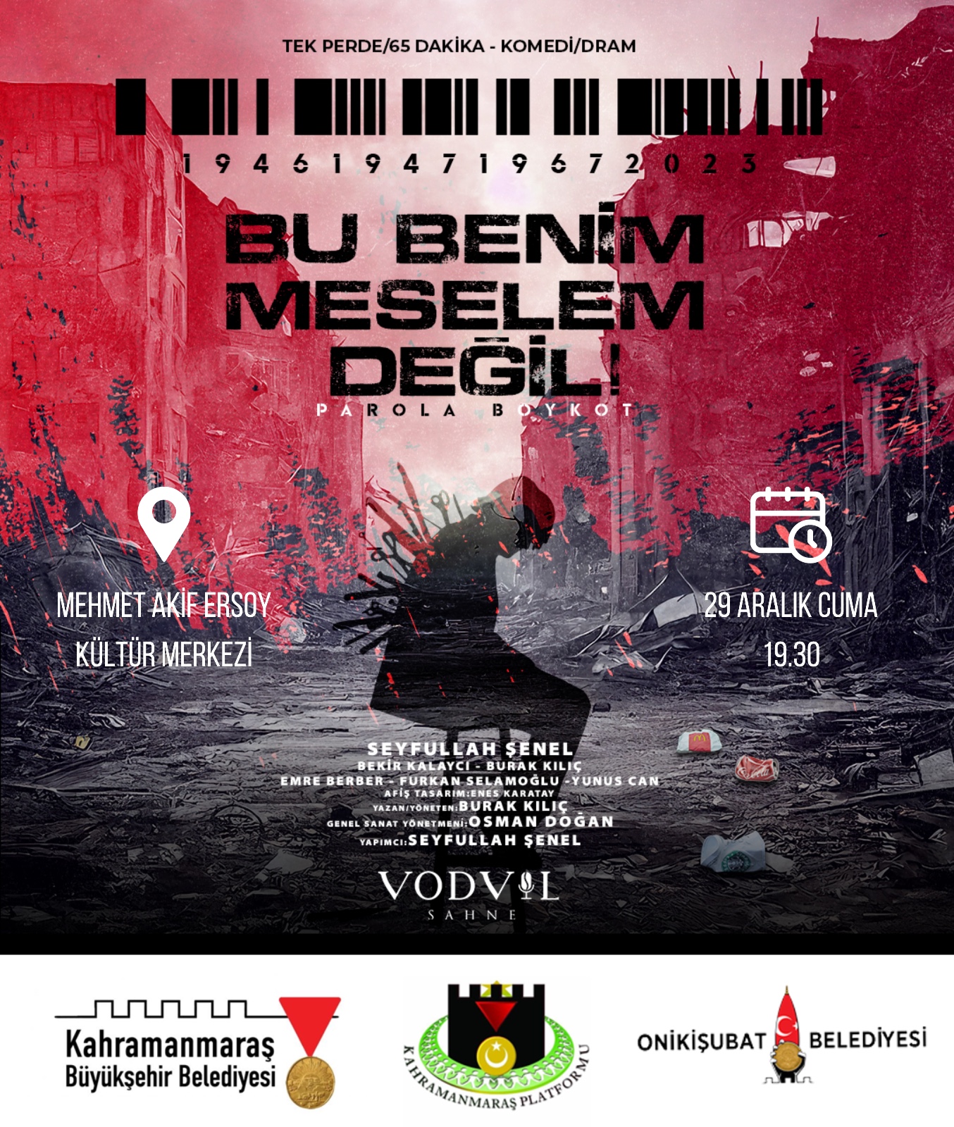Büyükşehir Belediyesi, İsrail destekçisi ürünlerin boykotunu konu alan ‘Bu Benim Meselem Değil’ adlı tiyatro gösterisini bugün saat 19.30’da Mehmet Akif Ersoy Kültür Merkezi’nde Kahramanmaraşlılarla buluşturacak.
