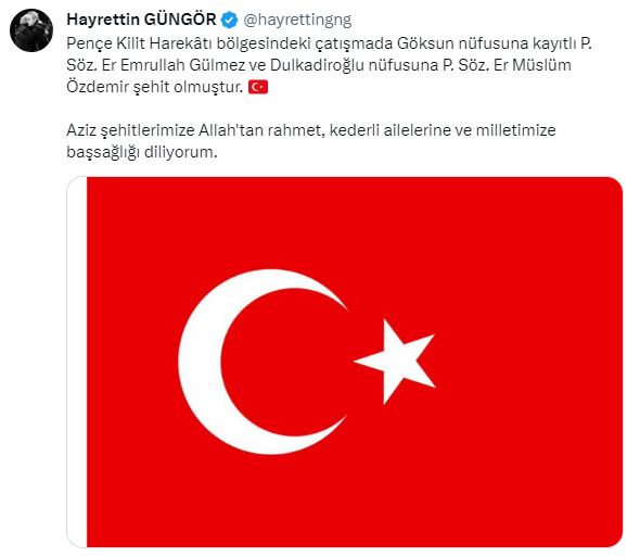 Kahramanmaraş Büyükşehir Belediye Başkanı Hayrettin Güngör, Pençe - Kilit Harekâtı bölgesinde bölücü terör örgütü mensuplarıyla çıkan çatışmada şehit düşen Kahramanmaraşlı mehmetçikler Piyade Sözleşmeli Er Emrullah Gülmez ve Piyade Sözleşmeli Er Müslüm Özdemir için taziye mesajı yayımladı. Başkan Hayrettin Güngör mesajında, “Pençe - Kilit Harekâtı bölgesinde çıkan çatışmada Göksun nüfusuna kayıtlı P. Söz. Er Emrullah Gülmez ve Dulkadiroğlu nüfusuna kayıtlı P. Söz. Er Müslüm Özdemir şehit olmuştur. Aziz şehitlerimize Allah’tan rahmet, kederli ailelerine ve milletimize baş sağlığı ve sabır diliyorum” ifadelerine yer verdi.