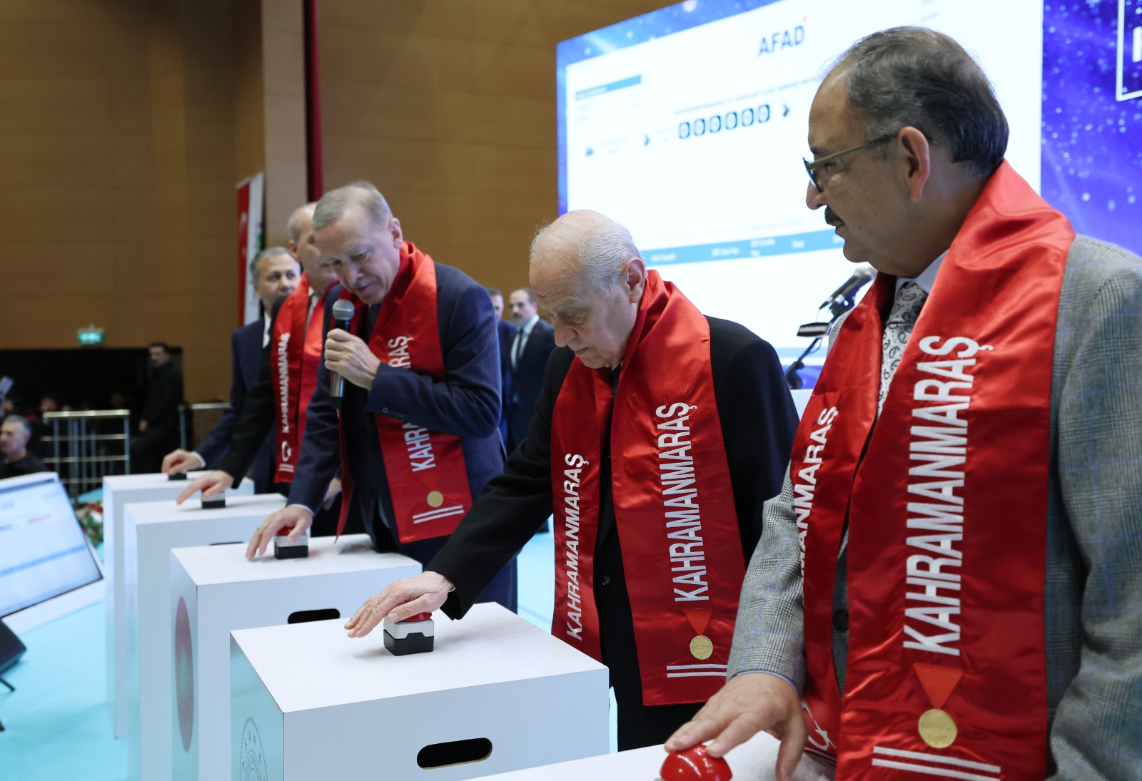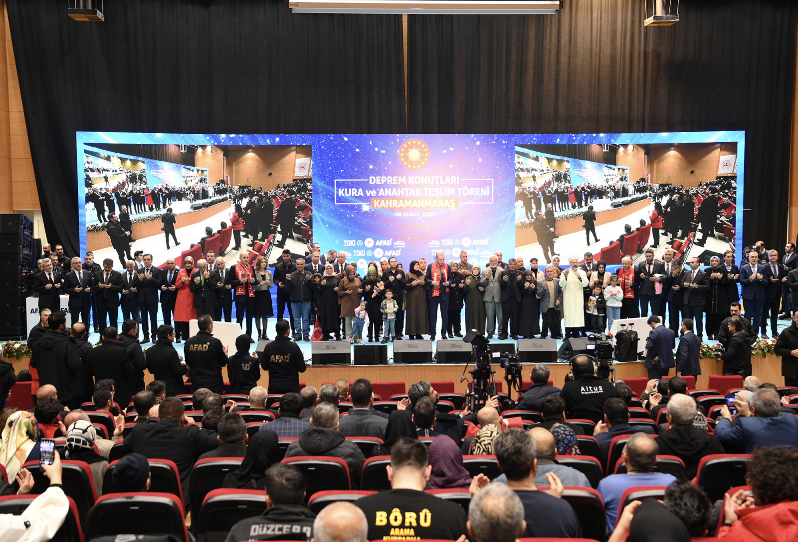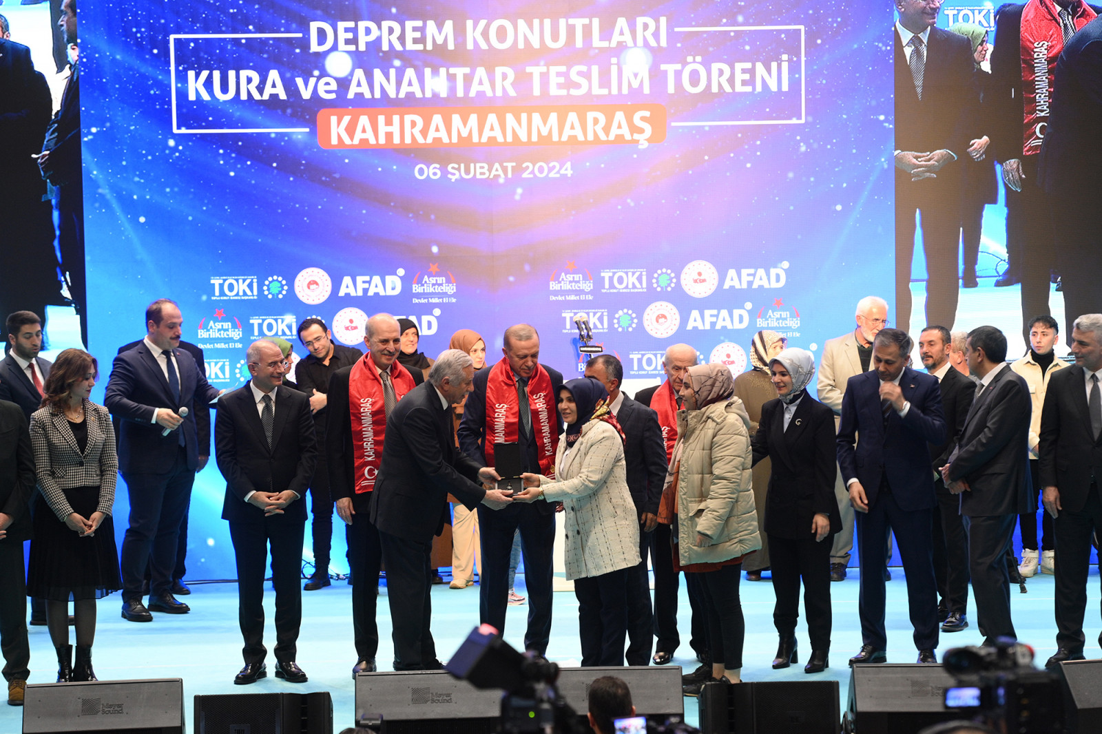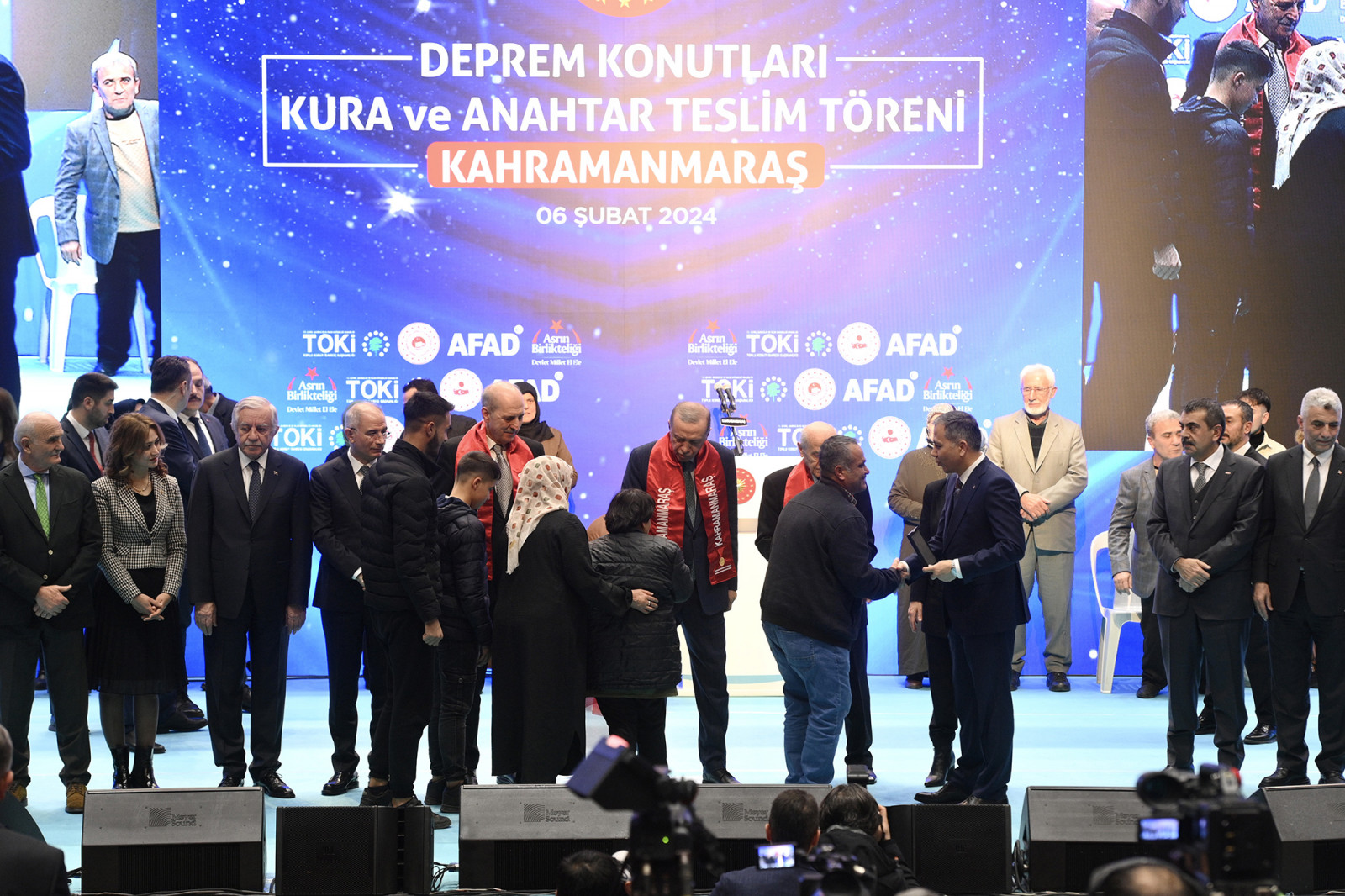 6 Şubat depremlerinin 1. yıl dönümünde Kahramanmaraş’a gelen Cumhurbaşkanı Recep Tayyip Erdoğan’ın teşrifleriyle “Deprem Konutları Kura ve Anahtar Teslim Töreni” gerçekleştirildi. KSÜ Yunus Emre Kongre ve Kültür Merkezi’nde gerçekleştirilen törende; Milliyetçi Hareket Partisi Genel Başkanı Dr. Devlet Bahçeli’nin yanı sıra; TBMM Başkanı Numan Kurtulmuş, Bakanlar, Diyanet İşleri Başkanı Ali Erbaş, 66. Hükümet Tarım ve Orman Bakanı Prof. Dr. Vahit Kirişci, Vali Mükerrem Ünlüer, milletvekilleri, Büyükşehir Belediye Başkanı Hayrettin Güngör, şehir protokolü ve vatandaşlar da yer aldı.