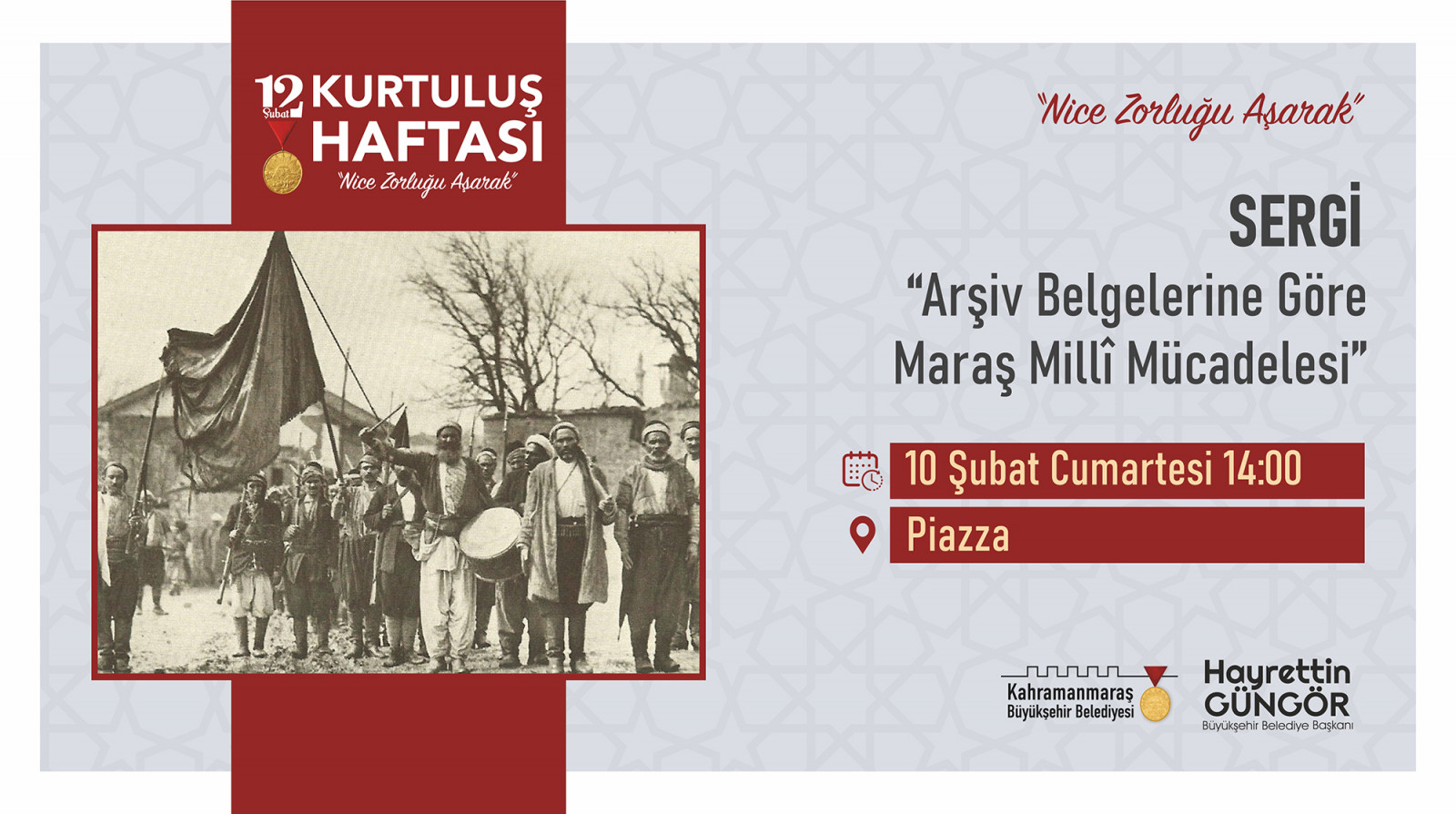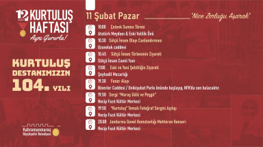 Kurtuluş Haftası etkinlikleri, 10 Şubat Cumartesi günü saat 14.00’da Piazza AVM’de “Kurtuluşumuzun Kahramanları” ve “Arşiv Belgelerine Göre Maraş Milli Mücadelesi” konulu sergilerin açılışıyla devam edecek. Aynı gün 19.30’da Necip Fazıl Kısakürek Kültür Merkezi’nde düzenlenecek konferansta Gazeteci – Yazar Yusuf Kaplan, Kahramanmaraşlılara seslenecek.
