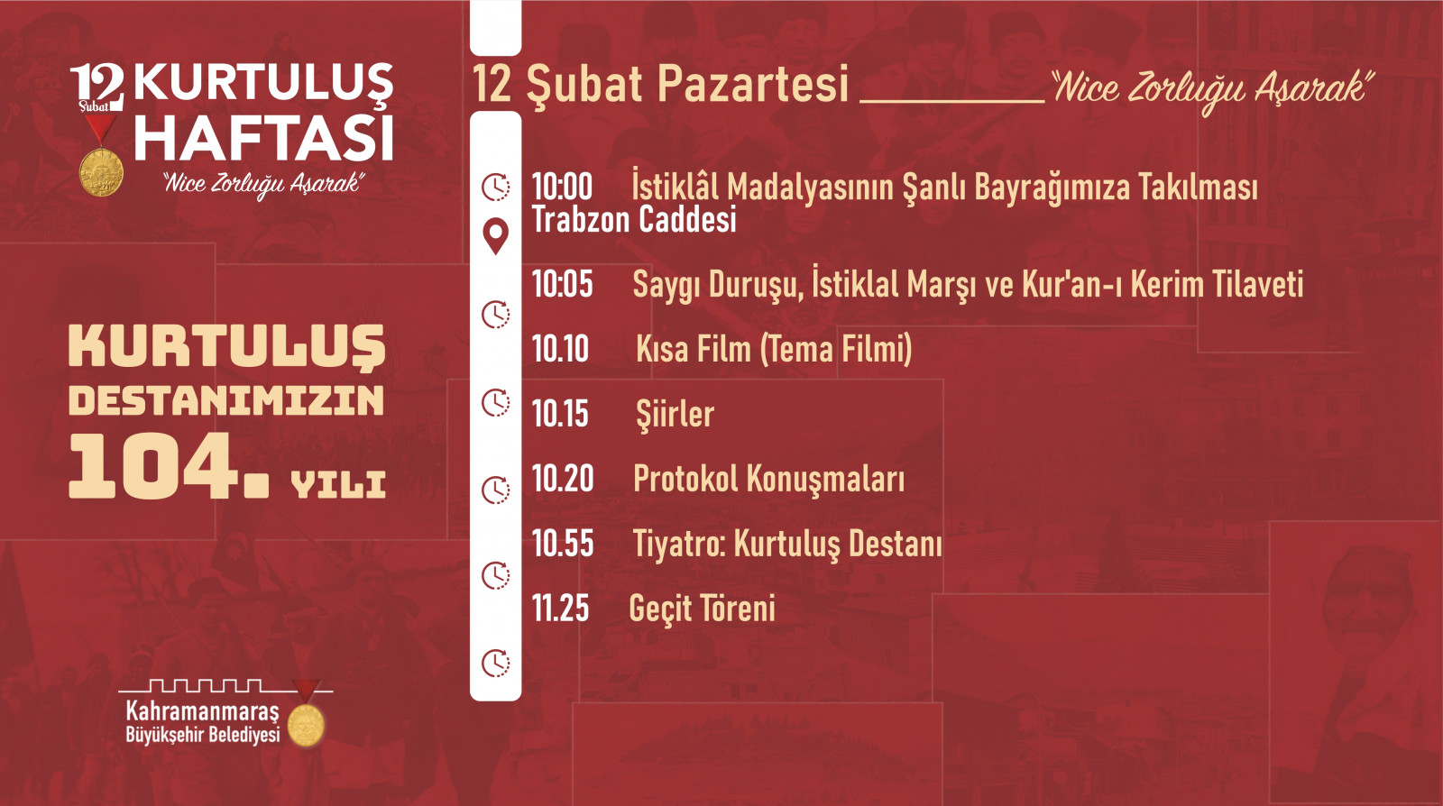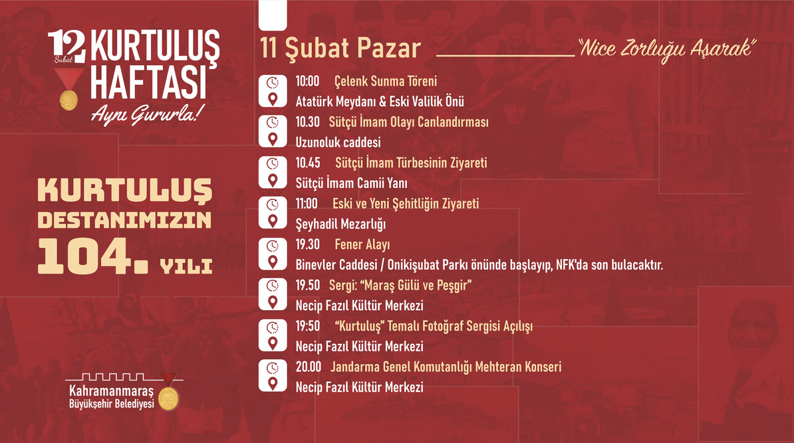 Kahramanmaraş’ın düşman işgalinden kurtuluşunun 104. yıl dönümü dolayısıyla şehirde “Nice Zorluğu Aşarak” temalı bir dizi etkinlik ve anma programı düzenlenecek. Kahramanmaraş Büyükşehir Belediyesi, Valilik ve paydaş kurumlar iş birliğiyle 9 – 12 Şubat tarihleri arasında; resim sergisinden söyleşiye, konferanstan fener alayına, mehteran konserinden şiir dinletisine, tiyatrodan kısa film gösterime onlarca etkinlik vatandaşlarla buluşturulacak.