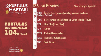 Kurtuluş Haftası programı, 12 Şubat Pazartesi günü Trabzon Caddesi’nde düzenlenecek bir dizi etkinlikle tamamlanacak. Saat 10.00’da başlayacak programda ilk olarak Büyükşehir Belediye Başkanı Hayrettin Güngör tarafından Türk Bayrağı’na şehrin sembolü olan İstiklal Madalyası takılıp göndere çekilecek. Devamında; Kur’an-ı Kerim Tilaveti, kısa film gösterimi, şiir dinletisi, protokol konuşmaları, “Kurtuluş Destanı” adlı tiyatro gösterisi ve geçit töreni gerçekleştirilecek.