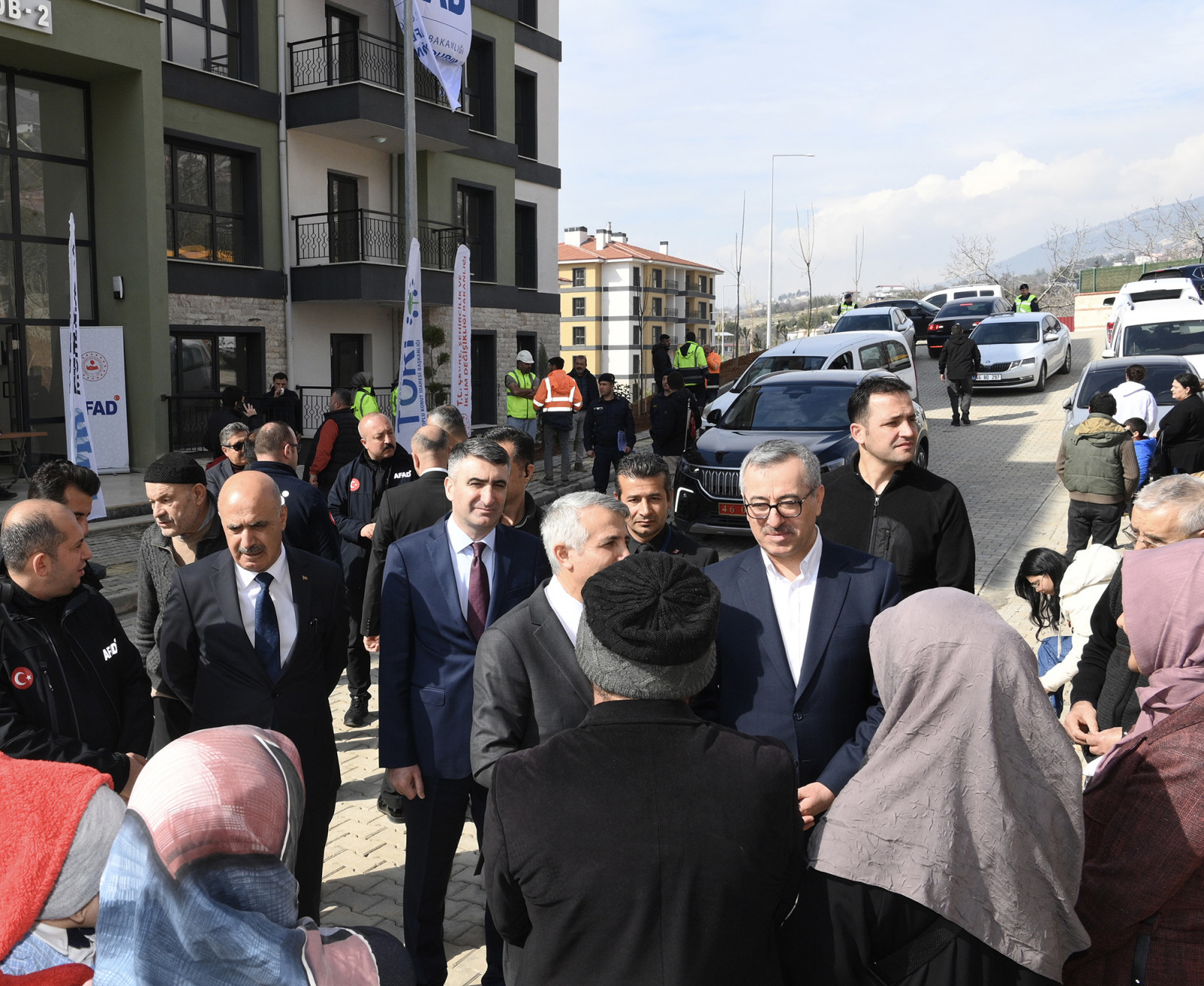 Kahramanmaraş Büyükşehir Belediye Başkanı Hayrettin Güngör, Vali Mükerrem Ünlüer ile Akyar TOKİ Konutları’nı ziyaret ederek incelemelerde bulundu. Dulkadiroğlu Kaymakamı Dr. Fatih Çelikkaya, İl Jandarma Komutanı Tuğgeneral Gökhan İnan, İl Emniyet Müdürü Nurettin Gökduman ve AFAD İl Müdürü Tayfun Temur’un da yer aldığı programda heyet, 6 Şubat’ta Cumhurbaşkanı Recep Tayyip Erdoğan’ın teşrifleriyle gerçekleştirilen kura çekimi sonrası kalıcı konutlarına kavuşan hak sahiplerine anahtarlarını teslim etti. Kalıcı konutlarına kavuşan vatandaşlara hayırlı olsun dileklerini ileten Başkan Hayrettin Güngör, “6 Şubat depremlerinin yıl dönümünde Cumhurbaşkanımız Sayın Recep Tayyip Erdoğan’ın teşrifleriyle 9 bin 289 konutun kurasını çektik. Kurada ismi çıkan vatandaşlarımıza anahtarları teslim ediliyor. Kalıcı konutlarına kavuşan tüm hemşehrilerimize hayırlı olsun dileklerimizi iletiyoruz. Tamamlanan kalıcı konutların teslimi peyderpey devam edecek” diye konuştu.