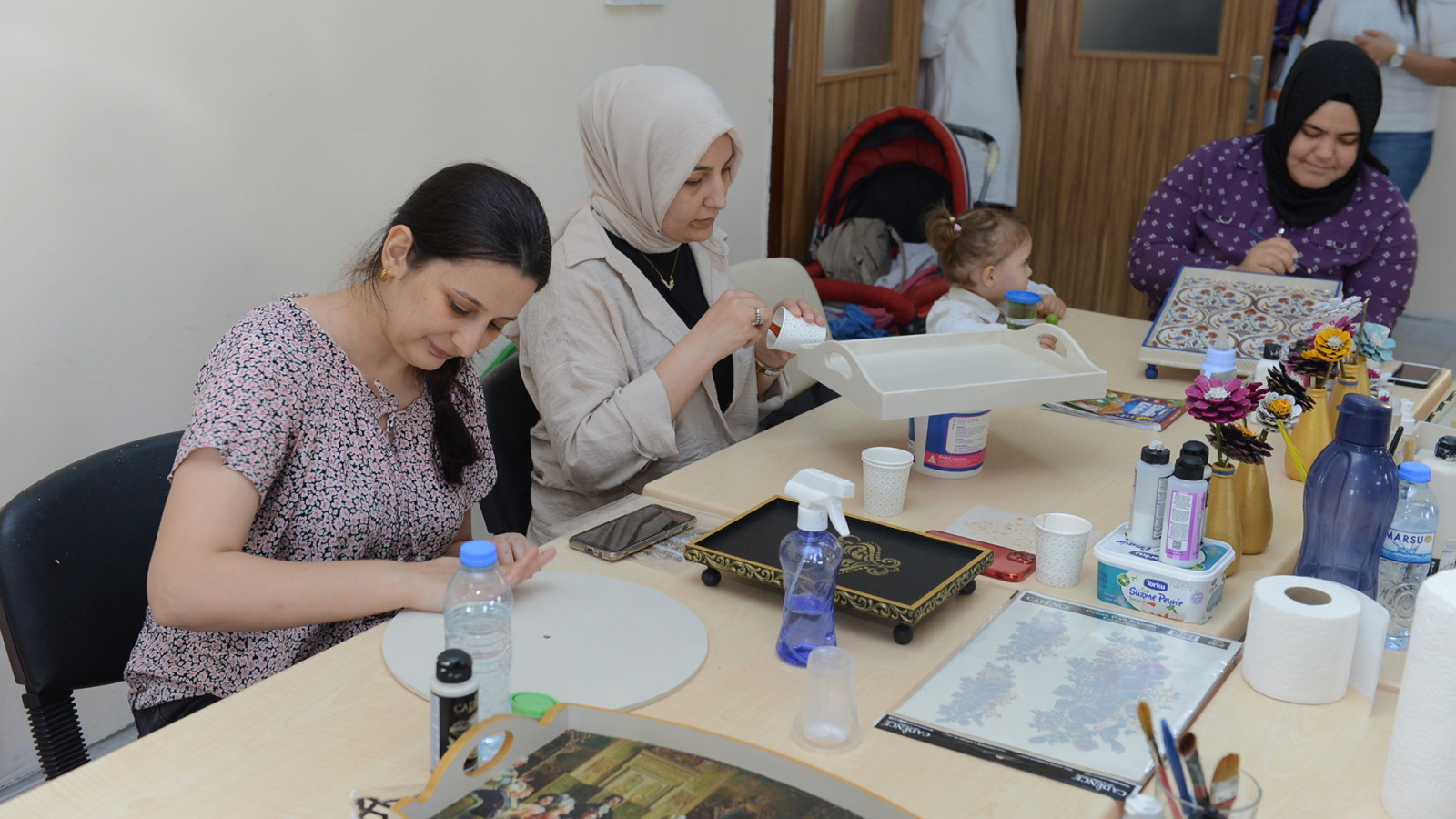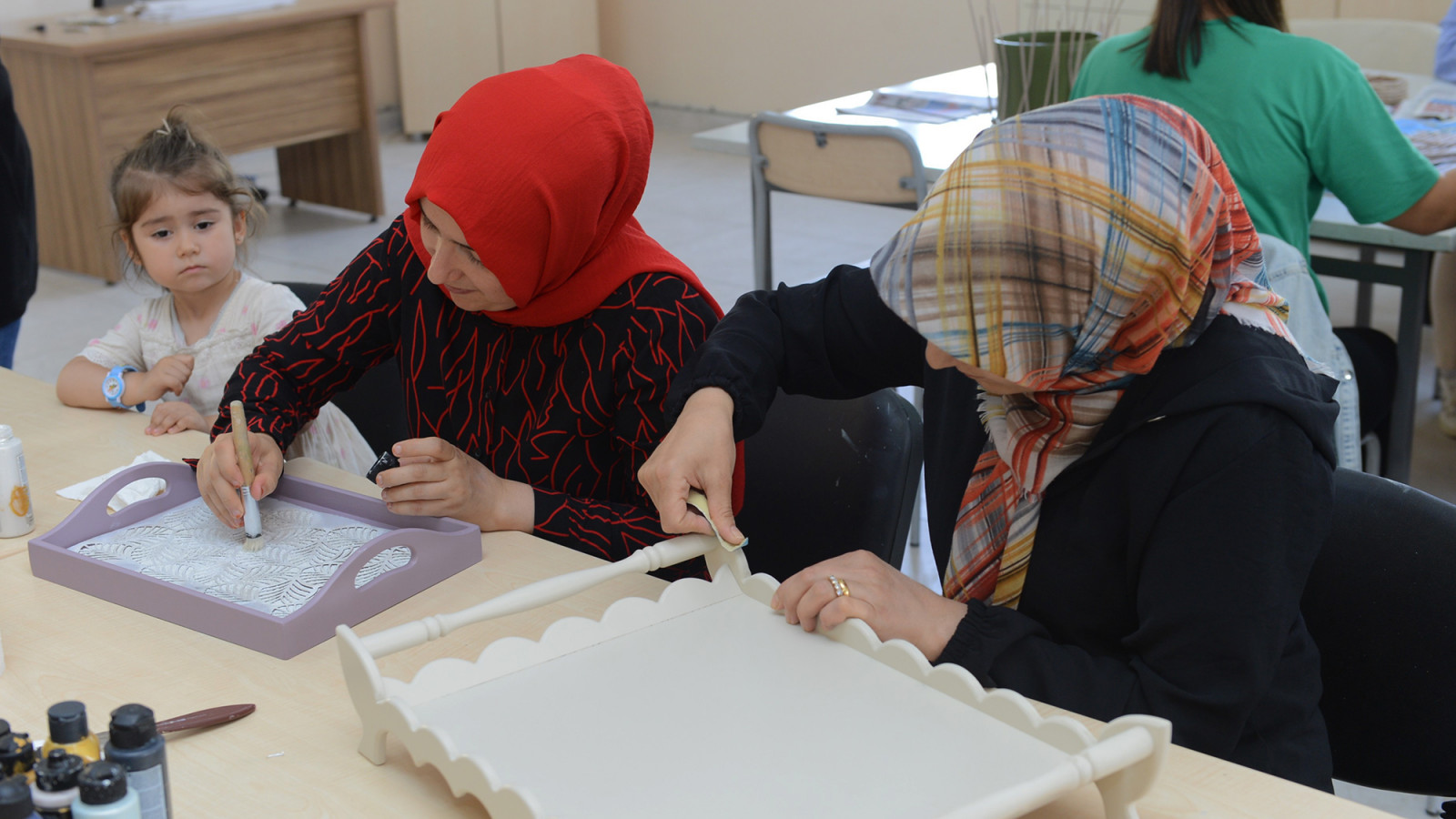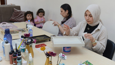 Sümeyra Berber, “7 aydır Mefruşat kursunda eğitim alıyorum. Mefruşata ilgim vardı ancak bu konuda hiç eğitim almamıştım. Deprem sonrası acılarımızı hafifletmek ve psikolojik olarak biraz daha rahatlamak için bu kursa kaydoldum. Burada öğrendiğim bilgilerle yaptığım el işlerini kendi evimde kullanıyorum. Burada hem sosyalleşme hem de el becerilerimizi geliştirme imkânı buluyoruz. Yeni arkadaşlar ediniyor, çok güzel bağlar kuruyoruz” dedi. Ayşe Nacar, “Ahşap boyama kursu öğrencisiyim. Depremden sonra kurulan çadır atölyelerinde de dikiş eğitimi almıştım. Psikolojik açıdan bu kurslar bana çok iyi geliyor. Buraya çocuklarımla birlikte geliyorum. Onlar için de bir farklılık oluyor, arkadaş ediniyorlar. Burada aldığım eğitimler neticesinde ürettiğim ürünlerin satışını yaparak aile ekonomisine de katkı sağlıyorum” diye konuştu. Zekiye Işık, “Ev hanımıyım. 6 aydır geri dönüşüm kursuna geliyorum. Burada hem zamanımı daha verimli değerlendiriyorum hem de yeni şeyler öğreniyorum. Geri dönüşümden kalemlik, abajur, tepsi gibi çok güzel ürünler yaptık. Ayrıca burada yeni arkadaşlar edinme fırsatım da oldu” ifadelerini kullandı.