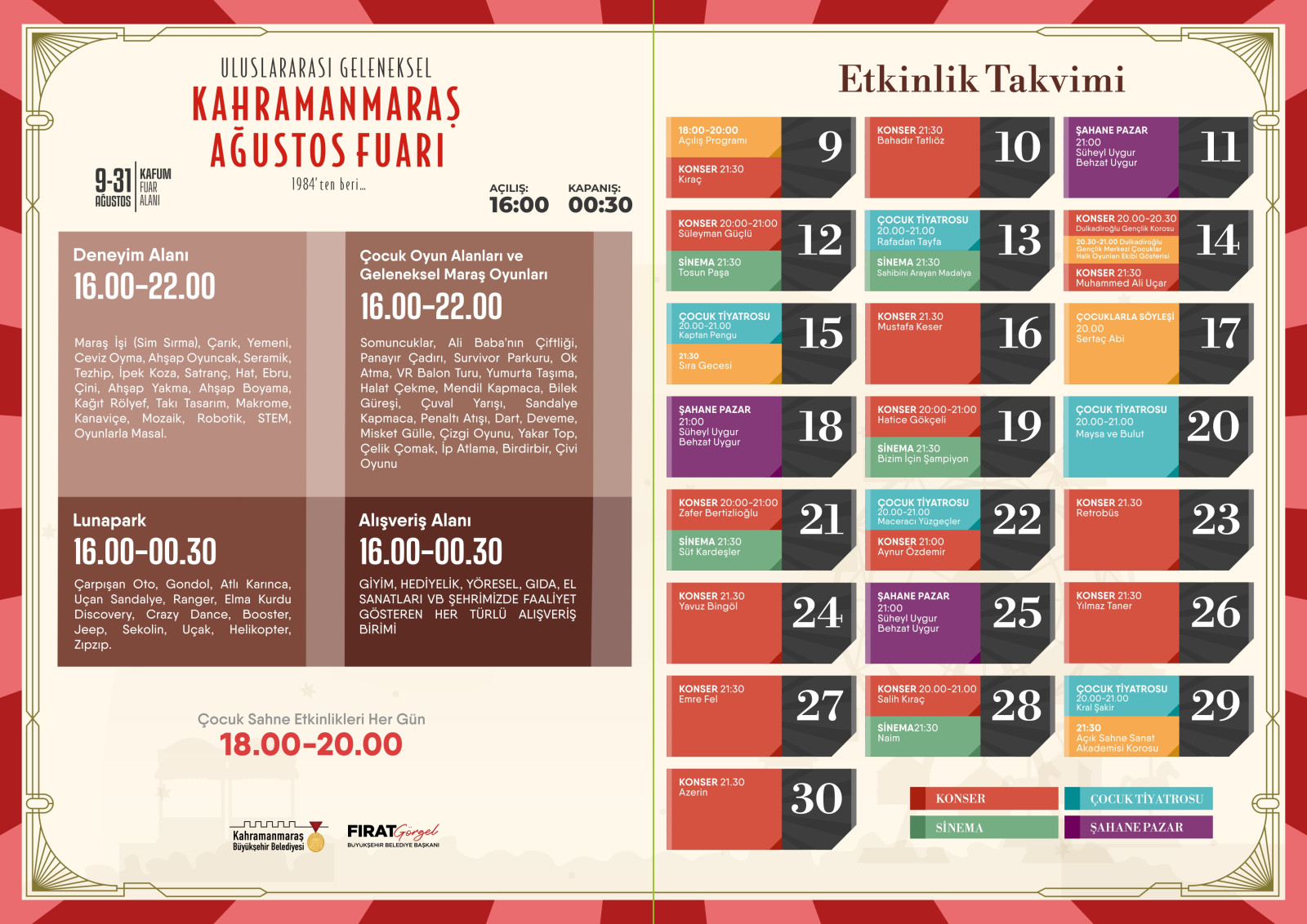 Kahramanmaraş Büyükşehir Belediyesinin 20 yıl aranın ardından yeniden düzenleyeceği Geleneksel Ağustos Fuarı etkinlik takvimi yayınlandı. 9 – 31 Ağustos tarihleri arasında KAFUM’da düzenlenecek fuarda 7’den 70’e tüm yaş gruplarına yönelik etkinlikler yer alacak. 22 gün sürecek program takvimine Büyükşehir Belediyesinin internet adresinden ulaşılabiliyor.