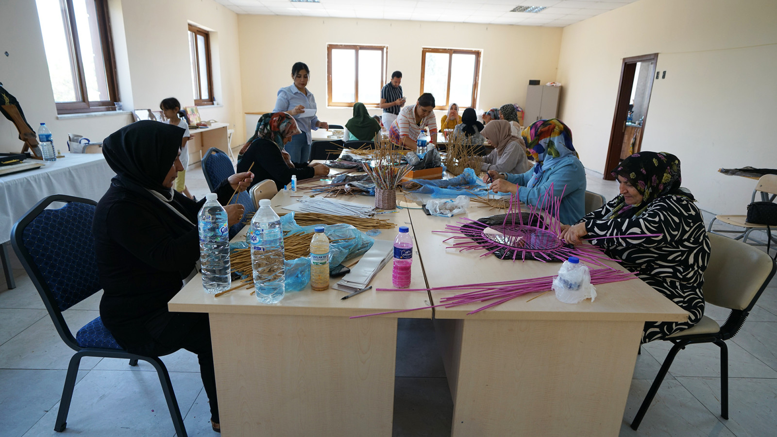 Kurs eğitmeni Nuray İrem Yavuz, "Atölyemizde kursiyerlerimiz bir yandan geri dönüşümden yeni ürünler oluştururken bir yandan da depremin getirdiği psikolojik travmaları bir nebze de olsa geride bırakma fırsatı buluyor. Atölyemizde geri dönüşümden faydalanarak supla, sepet, abajur ve kapı süsü gibi çeşitli ürünler oluşturuyoruz. Atık kâğıt ve cam gibi maddeleri atölyemizde daha kullanılabilir hale getiriyoruz. Kadınlar burada hem sosyalleşme hem de el becerilerini geliştirme imkânı buluyor. Ayrıca burada aldıkları eğitimle ürettikleri ürünlerin satışını yaparak aile ekonomisine de katkı sağlıyorlar" diye konuştu.