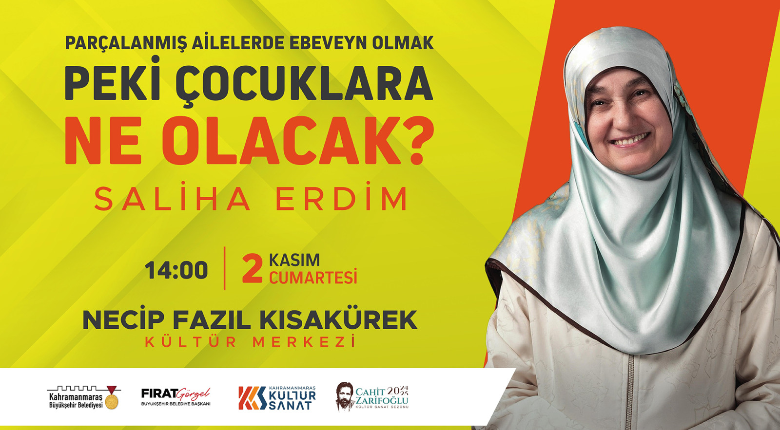 Şiir ve edebiyatın başkentinde çeşitli kültür sanat faaliyetlerini kesintisiz sürdüren Kahramanmaraş Büyükşehir Belediyesi, alanında uzman konukları Kahramanmaraşlılarla buluşturmaya devam ediyor. Bu kapsamda; kaleme aldığı Eşimi Anlamak İstiyorum, Sorusu Olmayanın Cevabı Yoktur, Hayat Filminden Kurtarıcı Kareler ve Anne Baba Çocuk İlişkisinde Kardeş Kıskançlığı gibi eserler ve katıldığı söyleşilerle ailelerin gönlüne dokunan, kendine has anlatımıyla beğeni toplayan ve büyük bir ilgiyle takip edilen Aile Danışmanı – Yazar Saliha Erdim’in katılımıyla “Parçalanmış Ailelerde Ebeveyn Olmak - Peki Çocuklara Ne Olacak” konulu söyleşi düzenlenecek. 2 Kasım Cumartesi günü Necip Fazıl Kısakürek Kültür Merkezi’nde düzenlenecek programda Saliha Erdim; aile içi bireylerin paylaşımları, aile içerisinde yaşanan sorunlar ve parçalanmış ailelerin ebeveyni olmak gibi pek çok konuyu farklı perspektiften ele alacak. Saat 14.00’da başlayacak programa başta ebeveynler olmak üzere tüm vatandaşlar davet edildi.