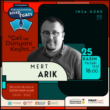 Söyleşilerin yanı sıra, okurlarıyla birebir iletişim kurmak isteyen yazarlar da imza günlerinde yer alıyor. Bu kapsamda Mert Arık, 25 Kasım Pazartesi günü 16.00 ile 18.00 saatleri arasında düzenlenecek imza günü etkinliğinde kitaplarını okurları için imzalayacak. Yalnızca söyleşi ve imza etkinlikleriyle değil, aynı zamanda çeşitli kültürel ve sanatsal programlarla da zengin bir içerik sunan 9. Uluslararası Kahramanmaraş Kitap Fuarı’na tüm vatandaşlar davet edildi.