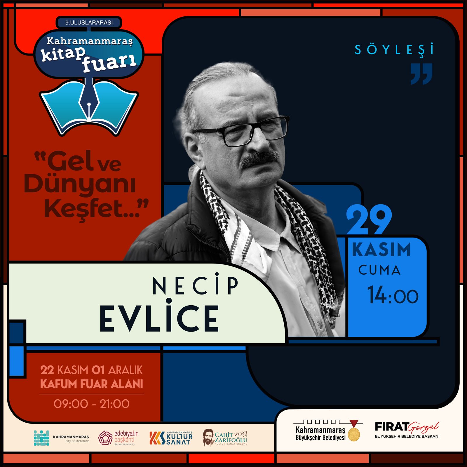 22 Kasım Cuma günü açılışı yapılan ve edebiyatseverlerin büyük beğenisini kazanan 9. Uluslararası Kitap Fuarı, zengin içerikleriyle dikkat çekmeye devam ediyor. KAFUM Fuar Alanı’nda düzenlenen ve her yaştan kitapseverin yoğun ilgi gösterdiği fuar, 29 Kasım Cuma günü de dolu dolu bir programla edebiyat tutkunlarını ağırlayacak. Günün ilk etkinliği, saat 14.00’da başlayacak. Usta yazar Necip Evlice, fuar alanında düzenlenecek söyleşide okurlarıyla bir araya gelecek. Evlice, edebiyata dair fikirlerini paylaşırken, okurlarından gelen soruları yanıtlayacak ve kitaplarına ilişkin keyifli bir sohbet gerçekleştirecek.