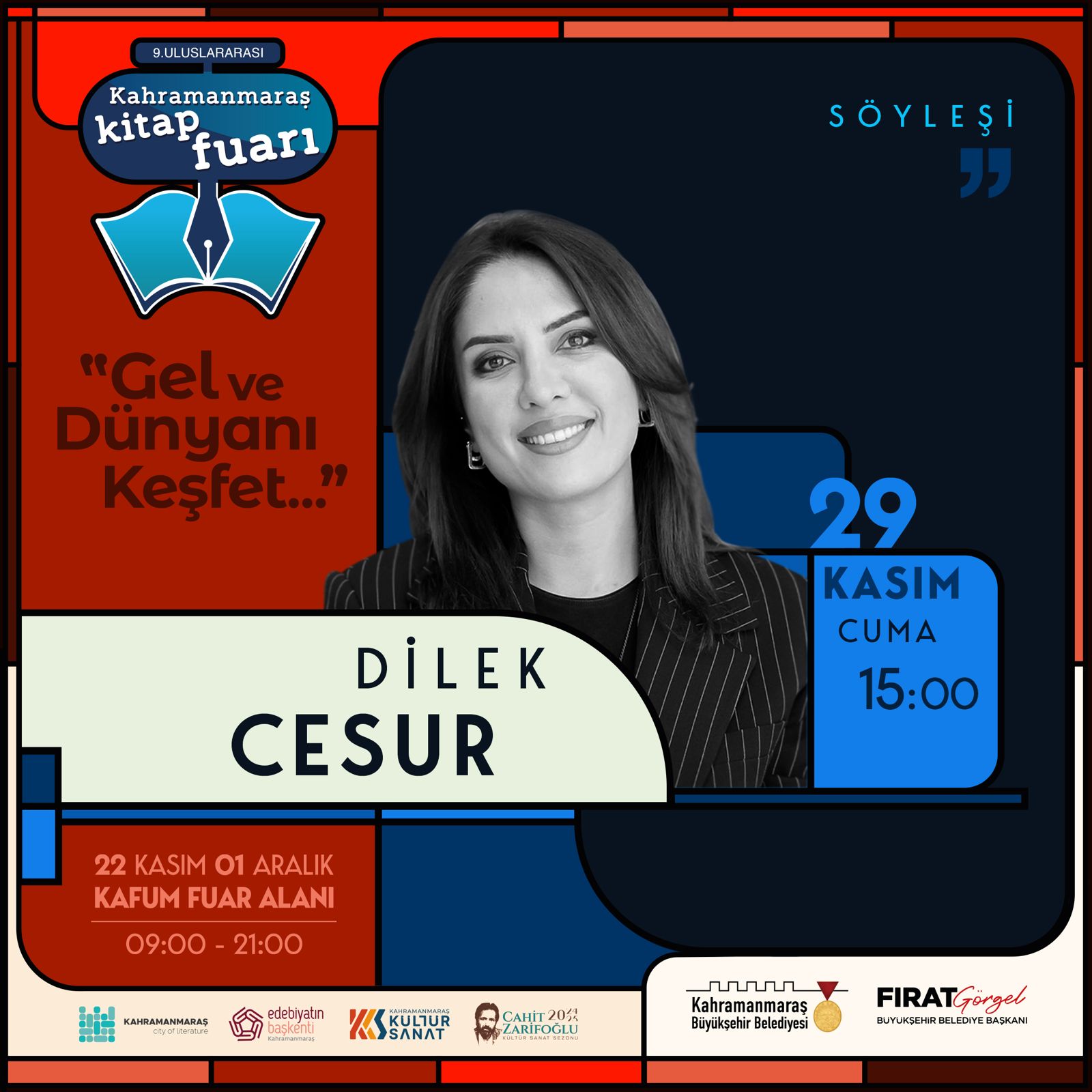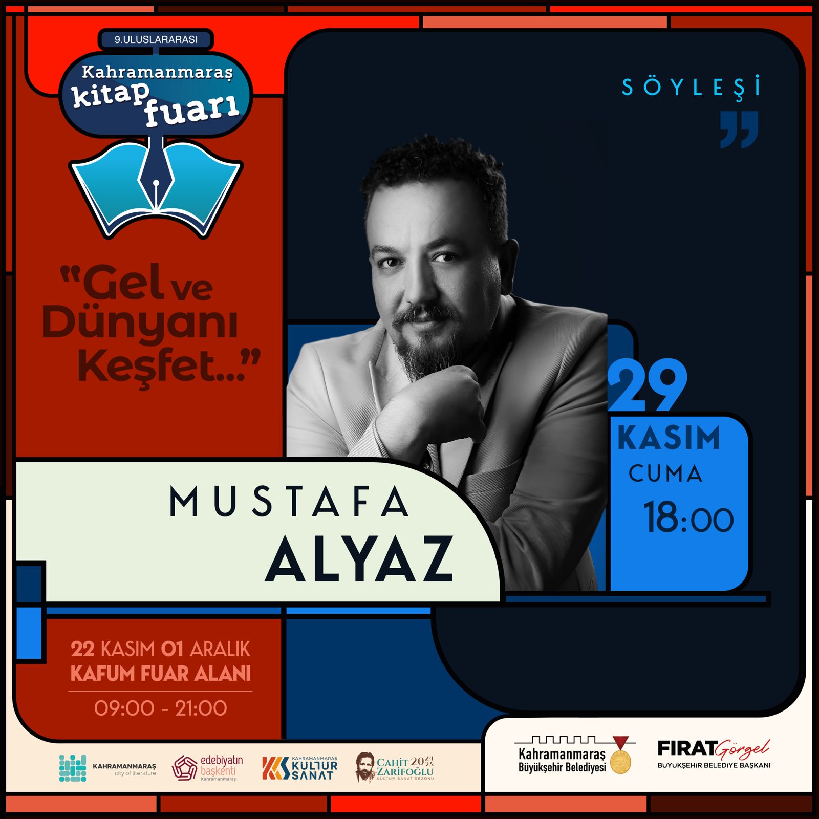 Büyükşehir Belediyesinin 9. Uluslararası Kitap Fuarı, 29 Kasım Cuma günü de birbirinden değerli isimleri edebiyatseverlerle buluşturmaya devam edecek. Necip Evlice, Dilek Cesur, Sertaç Abi, Uğur Batı ve Mustafa Alyaz, KAFUM’da vatandaşlarla bir araya gelecek.