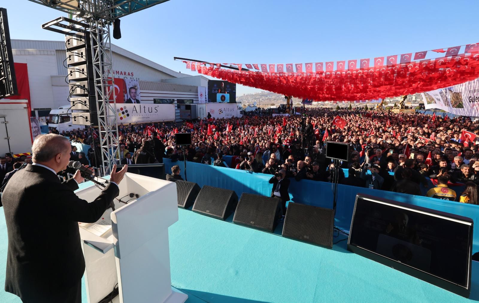 Cumhurbaşkanı Recep Tayyip Erdoğan, "Asrın felaketi olarak nitelendirilen Kahramanmaraş merkezli 6 Şubat 2023'deki depremlerinin yaralarını hızla sarmak için gece gündüz demeden çalışıyoruz. 'Dağlar ne kadar yüksek ise yol onun üstünden geçer' inancıyla şehrimizi eskisinden daha güzel, daha dayanıklı ve modern hâle getirmenin gayretindeyiz. Yıkımın büyüklüğü karşısında asla yılgınlığa kapılmadan asrın inşasını başlattık. O günden bugüne dek bir an olsun elimizi deprem bölgesinden çekmedik" diye konuştu.