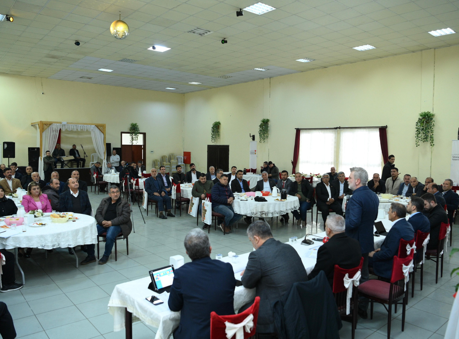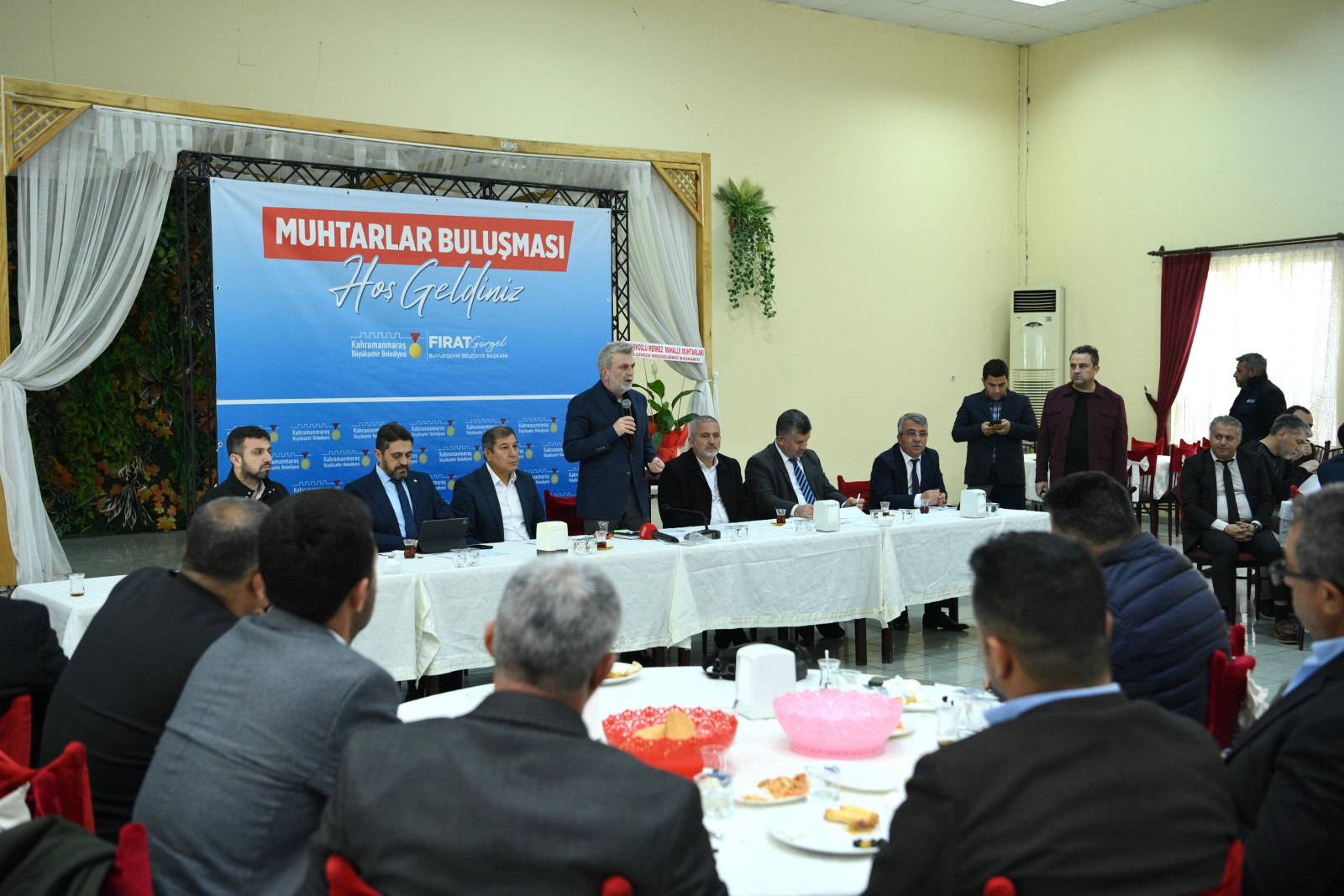 Muhtarlar Buluşması’nda konuşan Büyükşehir Belediye Başkanı Fırat Görgel, “Göreve geldiğimiz Nisan ayından bugüne 7 aylık süre geçti. Türkoğlu’nda alt ve üstyapı yatırımlarımızı hızlı bir şekilde sürdürüyoruz. 7 ayda Türkoğlu’na kazandırdığımız yatırımların toplam tutarı 300 Milyon TL. Bu süre zarfında ilçemize 32 kilometre içmesuyu hattı, 8 içmesuyu deposu ve 23 sondaj kuyusu kazandırdık. İlçe merkezinde içmesuyu şebeke yenileme çalışmaları kapsamında 132 Milyon TL’lik yatırımla 125 kilometre içmesuyu hattı ve 4 adet içmesuyu deposu İLBANK tarafından yenilendi. Şebeke yenileme çalışmasının ardından büyük bir kısmı tamamlanan abone bağlantısı işlerinde son aşamadayız. Bu çalışmamızın da yatırım bedeli 18 Milyon TL. 2025 yılında altyapı çalışmalarımız hızla sürecek. Türkoğlu – Kılılı kanalizasyon kolektör hattının bağlantısını İLBANK iş birliğiyle gerçekleştireceğiz inşallah. 80 Milyon TL’lik yatırımla bu projemizi de Türkoğlu’na kazandıracağız” cümlelerini kaydetti.