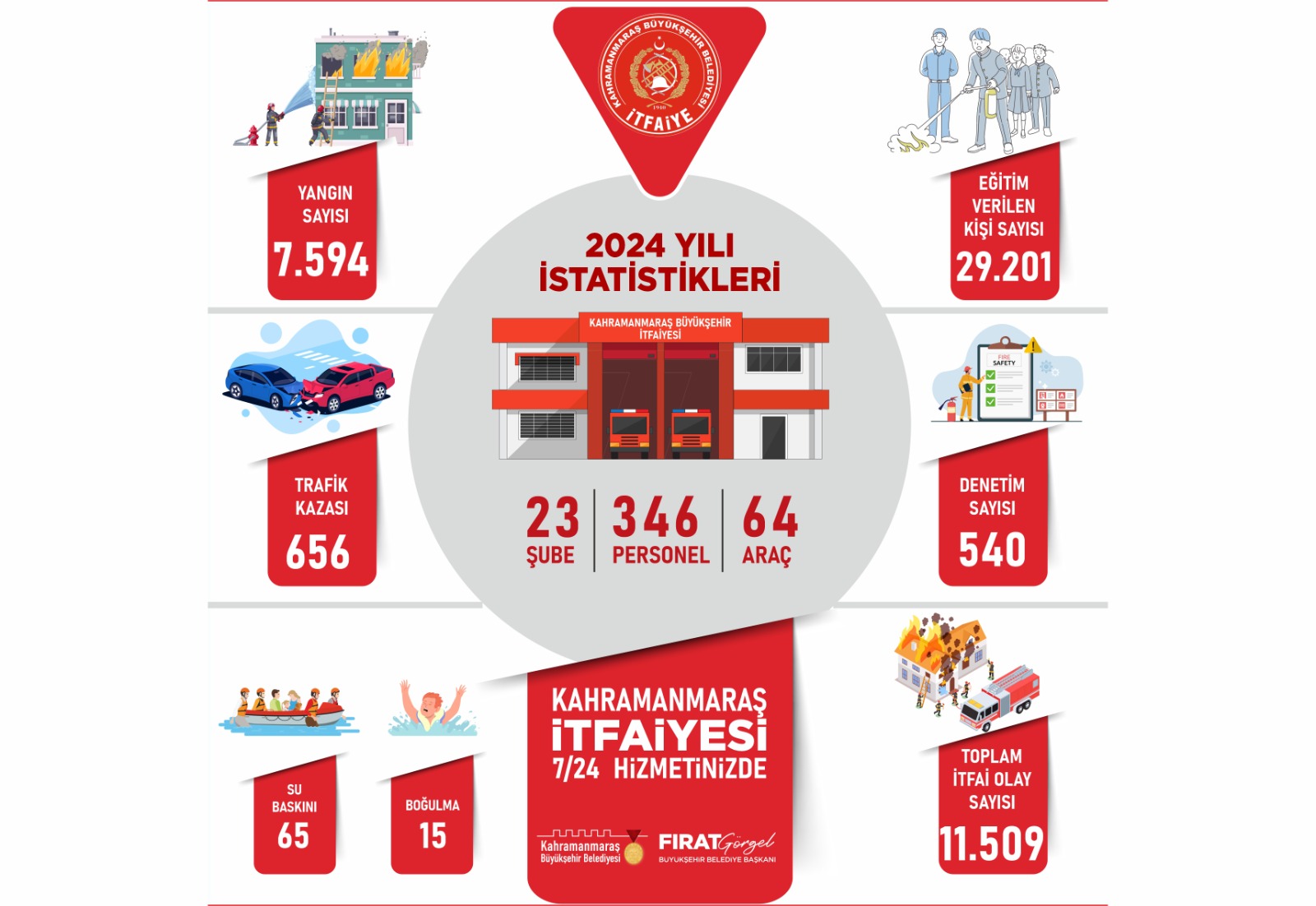 Kahramanmaraş Büyükşehir Belediyesi İtfaiyesi, 2024 yılı boyunca vatandaşların güvenliği için üstün bir çaba sergileyerek hem hızlı hem de etkin müdahaleleriyle göz doldurdu. Yangından trafik kazalarına, su baskınından boğulma vakalarına kadar birçok alanda görev yapan itfaiye ekipleri, profesyonel kadrosu ve modern ekipmanlarıyla can ve mal kaybını en aza indirme gayreti gösterdi. 23 şubesi, 346 deneyimli personeli ve 64 aracıyla yıl boyunca sahada aktif olarak çalışan İtfaiye Dairesi Başkanlığı, 2024 yılında; 7 bin 594 yangın, 656 trafik kazası, 65 su baskını, 15 boğulma olayı ve 11 bin 509 itfai olay olmak üzere toplam 19 bin 839 olaya müdahale etti.
