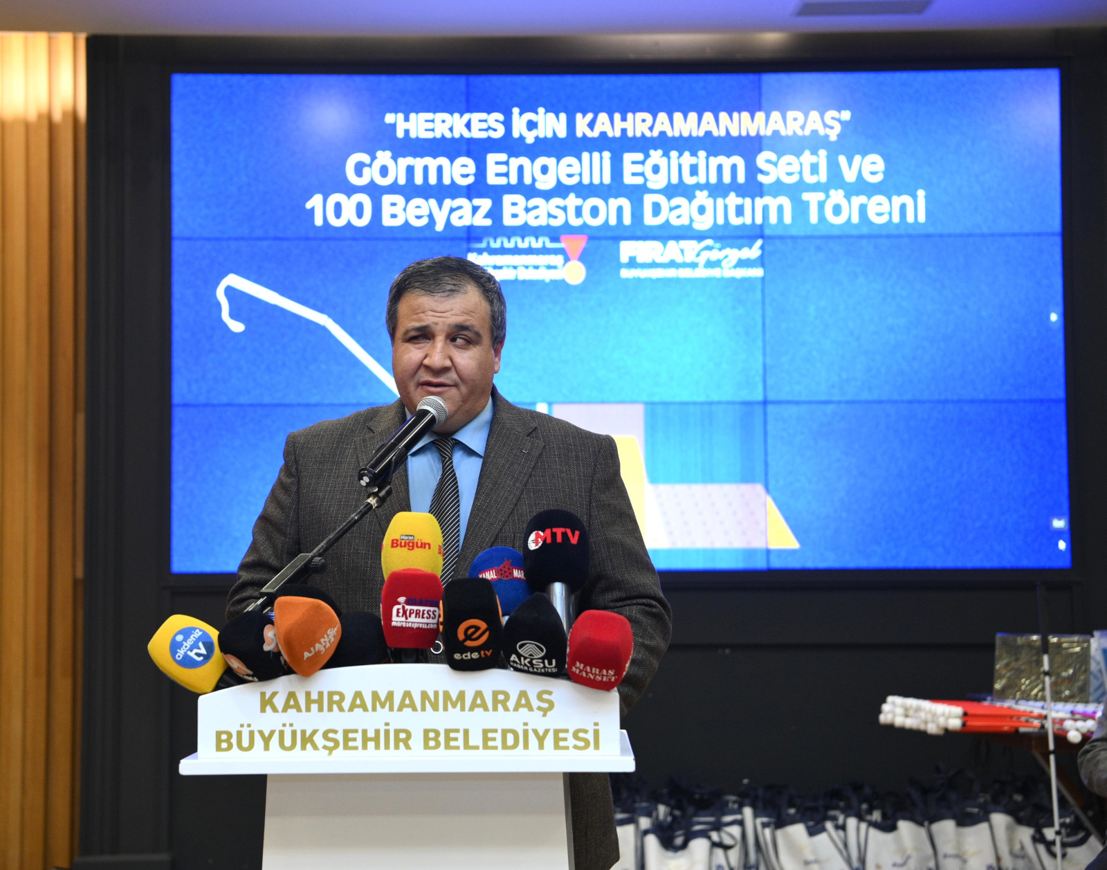 7 - 14 Ocak Beyaz Baston Görme Engelliler Haftası dolayısıyla düzenlenen etkinlikte konuşan Başkan Görgel, “Engelli kardeşlerimizin toplumsal hayatın her alanında güçlü bir şekilde yer alması için çalışmak bizim en önemli görevlerimizden bir tanesi. Yeni Kahramanmaraş’ı engelli kardeşlerimiz için daha erişilebilir bir hale getirmek için yoğun gayretimizi sürdürüyoruz” dedi. Programda görme engelli vatandaşlara 100 beyaz baston ve öğrencilere de eğitim seti verildi.
