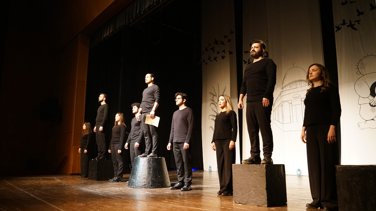 Kahramanmaraş Büyükşehir Belediyesi Sahne Maraş Tiyatro Okulu öğrencilerinin sahnelediği “Sabah Gibi Geri Döneceğiz” adlı tiyatro gösterisi, izleyicilere duygu dolu anlar yaşattı. Necip Fazıl Kısakürek Kültür Merkezi’nde sahnelenen oyuna tiyatroseverler yoğun ilgi gösterdi. Filistin’in mücadelesini konu alan ve insanlığın ortak vicdanını harekete geçirmeyi amaçlayan oyun, hem sahne tasarımı hem de dramatik anlatımıyla büyük beğeni topladı. Oyunun sonunda Sahne Maraş Tiyatro Okulu öğrencileri, performanslarından dolayı seyirciler tarafından ayakta alkışlandı.