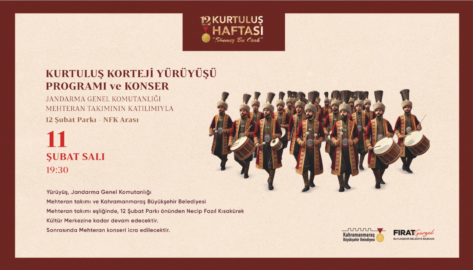 Kahramanmaraş’ın düşman işgalinden kurtuluşunun 105. yıl dönümü, “Sönmez Bu Ocak” temasıyla Kahramanmaraş Büyükşehir Belediyesi, Valilik ve paydaş kurumların iş birliğiyle düzenlenecek etkinliklerle kutlanacak. 7 - 12 Şubat tarihleri arasında gerçekleştirilecek programlar kapsamında anma törenleri, konferanslar, tiyatro gösterileri ve kortej yürüyüşleri gibi birçok etkinlik düzenlenecek.
