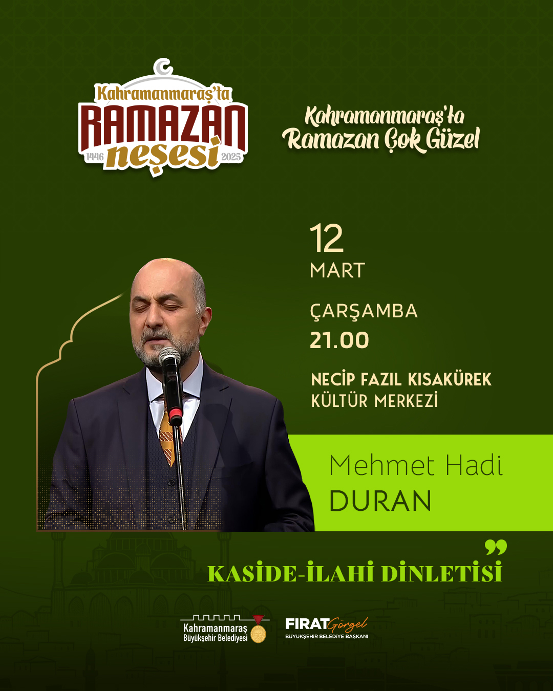 Ramazan ayının manevi iklimini Kahramanmaraşlılarla buluşturan Büyükşehir Belediyesi, etkinliklerine bir yenisini daha ekliyor. “Kahramanmaraş’ta Ramazan Çok Güzel” temasıyla organize edilen programda, Türkiye’nin sevilen dini musiki sanatçılarından Mehmet Hadi Duran, kaside ve ilahilerle gönüllere hitap edecek. Saat 21.00’da başlayacak etkinlikte sanatçı Duran, Ramazan ayına özel kaside ve ilahileri seslendirerek dinleyicilere unutulmaz bir gece yaşatacak. Necip Fazıl Kısakürek Kültür Merkezi’nde gerçekleştirilecek bu özel programda, manevi duygular zirveye çıkacak. Etkinliğe katılım ücretsiz olup, tüm vatandaşlar bu manevi geceye davet edildi.