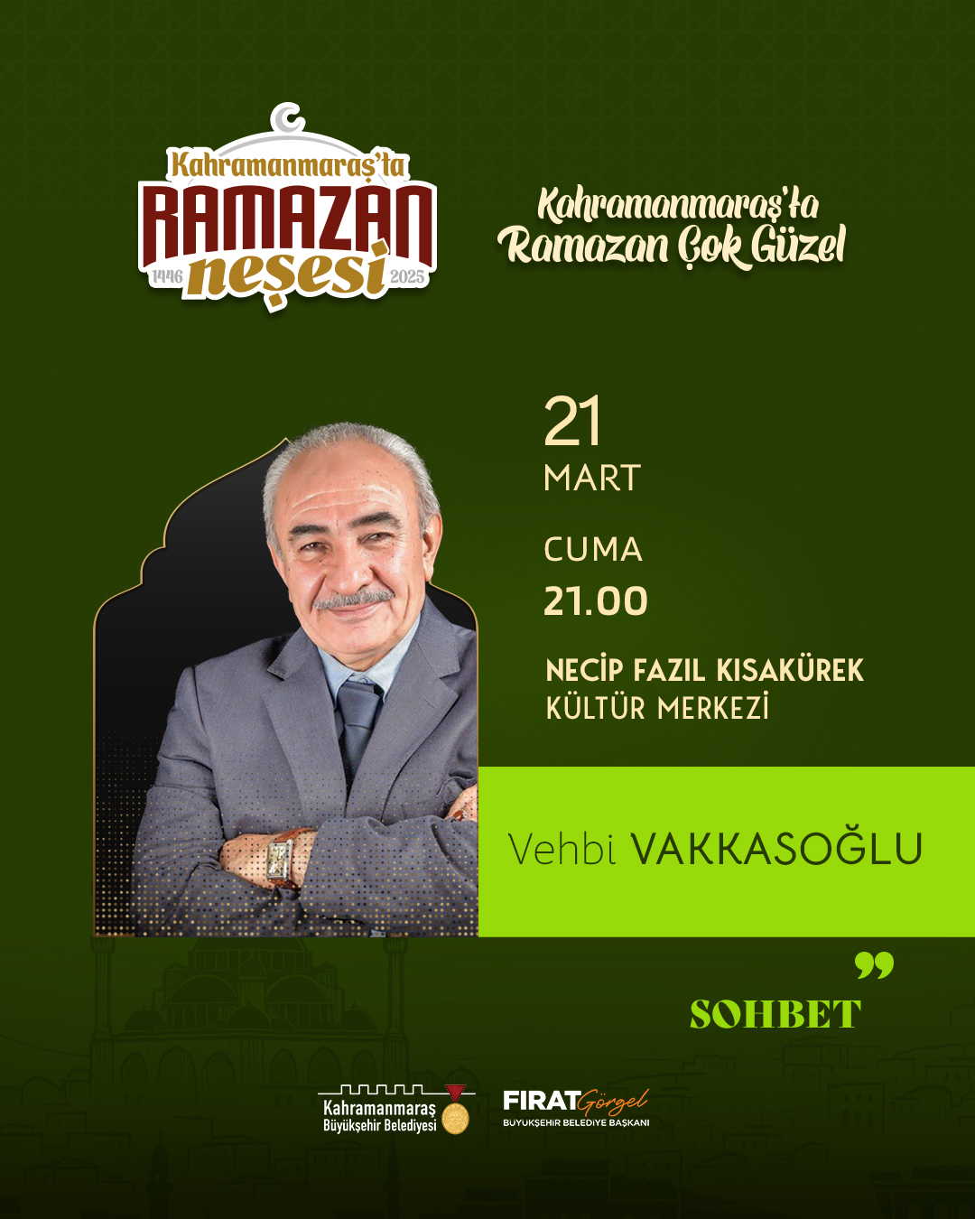 Büyükşehir Belediyesinin Ramazan etkinlikleri, 21 Mart Cuma günü NFK Kültür Merkezi’nde gerçekleştirilecek Vehbi Vakkasoğlu söyleşisiyle devam edecek.