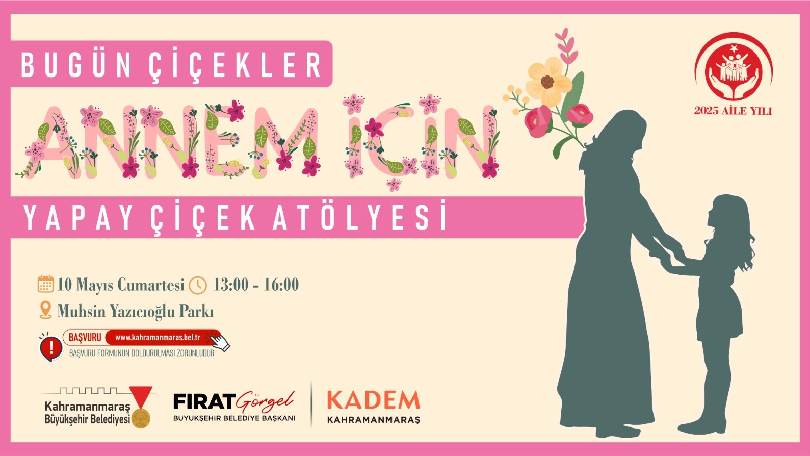 Kahramanmaraş Büyükşehir Belediyesi, Anneler Günü’ne özel olarak duygusal ve yaratıcı bir etkinliğe imza atmaya hazırlanıyor. Kadın ve Demokrasi Derneği (KADEM) iş birliğiyle düzenlenecek “Bugün Çiçekler Annem İçin” temalı yapay çiçek yapım atölyesi, çocuklar ve annelerini aynı çatı altında buluşturacak. 10 Mayıs Cumartesi günü gerçekleştirilecek olan etkinlik, saat 13.00’da başlayacak ve 16.00’a kadar devam edecek. Etkinlik, şehrin gözde sosyal alanlarından biri olan Muhsin Yazıcıoğlu Parkı’nda gerçekleştirilecek. Renkli ve keyifli bir ortamda düzenlenecek atölye, çocuklara hem el becerilerini geliştirme hem de annelerine el emeğiyle hazırlanmış özel bir hediye verme fırsatı sunacak. Etkinlik 7 – 13 yaş arasındaki çocuklar ve annelerine yönelik olarak planlandı. Katılımın kontenjanla sınırlı olduğu atölye çalışmasına https://kahramanmaras.bel.tr/duyuru/2025/05/06/yapay-cicek-yapim-atolyesi-basvuru-formu internet adresinden çevrimiçi başvuru yapılabiliyor.