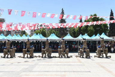 Program, Gazi Mustafa Kemal Atatürk ve silah arkadaşları başta olmak üzere tüm şehitler anısına yapılan saygı duruşu ve İstiklal Marşı’nın okunmasıyla başladı. Ardından, gençlerin hazırladığı şiir ve müzik dinletileri büyük beğeni toplarken, günün anlam ve önemini yansıtan sinevizyon gösterisi katılımcılara duygu dolu anlar yaşattı. Genç sporcuların sergilediği sportif gösteriler ve halk oyunları ekibinin sahnelediği geleneksel danslar, izleyenlerden uzun süre alkış aldı. Ayrıca İl Jandarma Komutanlığı Komando Bölüğü’nün gerçekleştirdiği tüfekli hareketler gösterisi, hem disiplin hem de estetik açıdan törende öne çıkan anlardan biri oldu. Kutlamalar, gençlerin dinamizmini, halkın birlikteliğini ve milli iradenin gücünü bir kez daha ortaya koyarken, 19 Mayıs’ın sadece bir tarih değil; aynı zamanda bir diriliş ve yeniden doğuş günü olduğu vurgulandı.