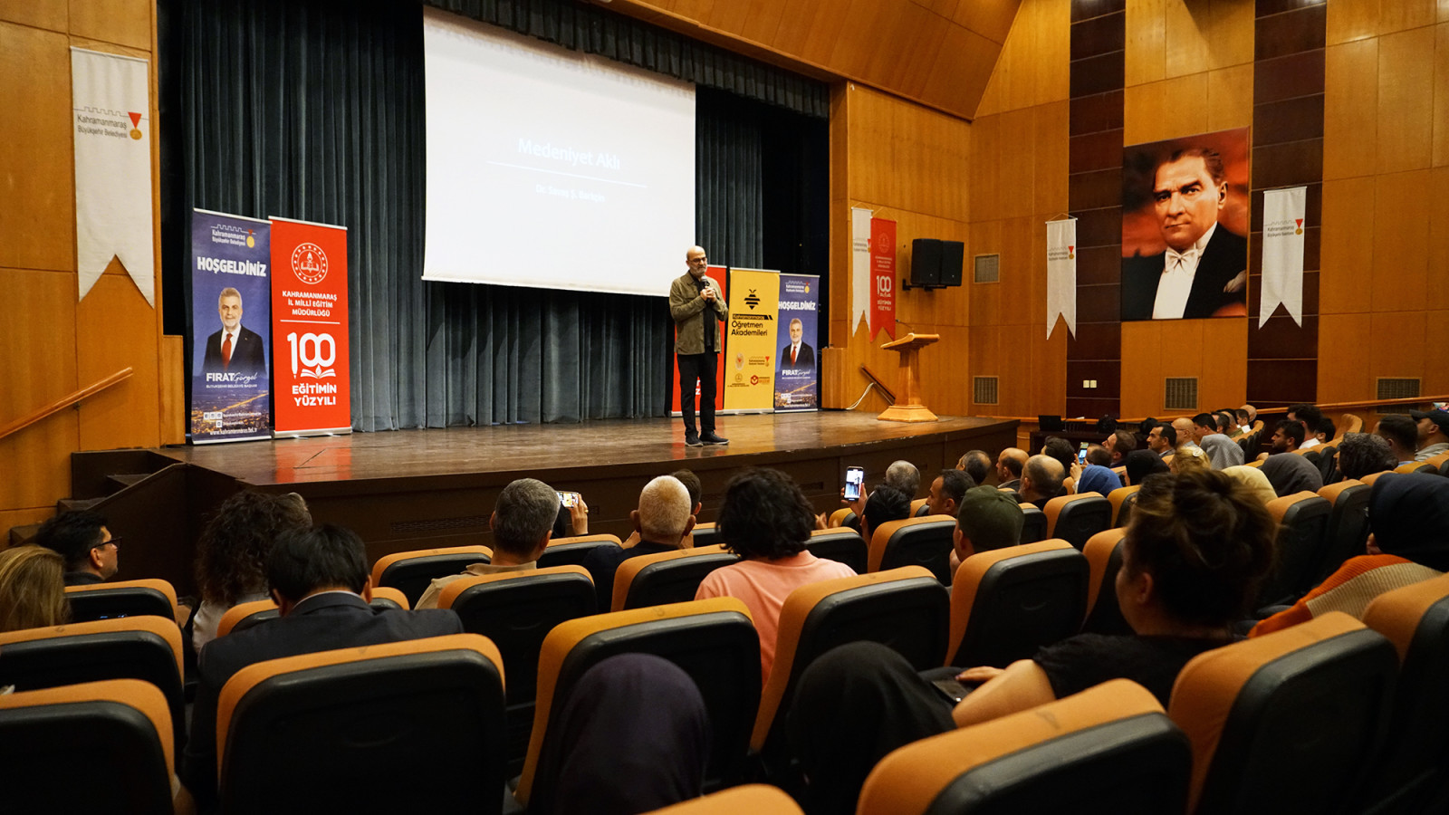 Kahramanmaraş Büyükşehir Belediyesi, kültür ve sanat organizasyonlarına bir yenisini daha ekledi. Toplumun her kesimine hitap eden etkinlikleriyle dikkat çeken Büyükşehir Belediyesi, İl Milli Eğitim Müdürlüğü iş birliğiyle edebiyatseverleri anlamlı bir programda buluşturdu. Necip Fazıl Kısakürek Kültür Merkezi’nde düzenlenen ve yoğun katılımın olduğu “Medeniyet Aklı” konulu söyleşide, Türk edebiyatının saygın isimlerinden Yazar Savaş Barkçin, edebiyat ve düşünce dünyasına dair derinlikli değerlendirmelerde bulundu. Eserlerinde gelenekle modernliği, gönülle aklı buluşturan bir çizgide yürüyen Barkçin, konuşmasında kültürel mirasımızın taşıyıcısı olan medeniyet aklını günümüz dünyasında nasıl yeniden anlamlandırabileceğimizi ele aldı. Katılımcılar tarafından ilgiyle takip edilen programda edebiyatseverler, hem bilgi hem de ilham dolu bir söyleşiye tanıklık etmenin memnuniyetini dile getirdi.