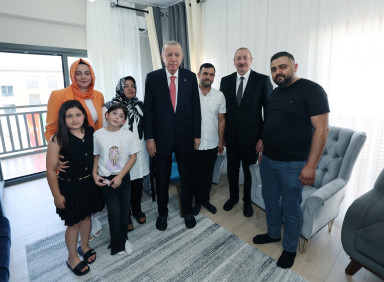 Cumhurbaşkanı Recep Tayyip Erdoğan ve Azerbaycan Cumhurbaşkanı İlham Aliyev, Kahramanmaraş’ta gerçekleştirilen ‘250 Bininci Konut Teslim ve Kura Çekim Töreni’nin ardından Azerbaycan Mahallesi’ndeki konutuna yerleşen depremzede aileyi ve mahallede açılan Haydar Aliyev İlkokulu’nu ziyaret etti.