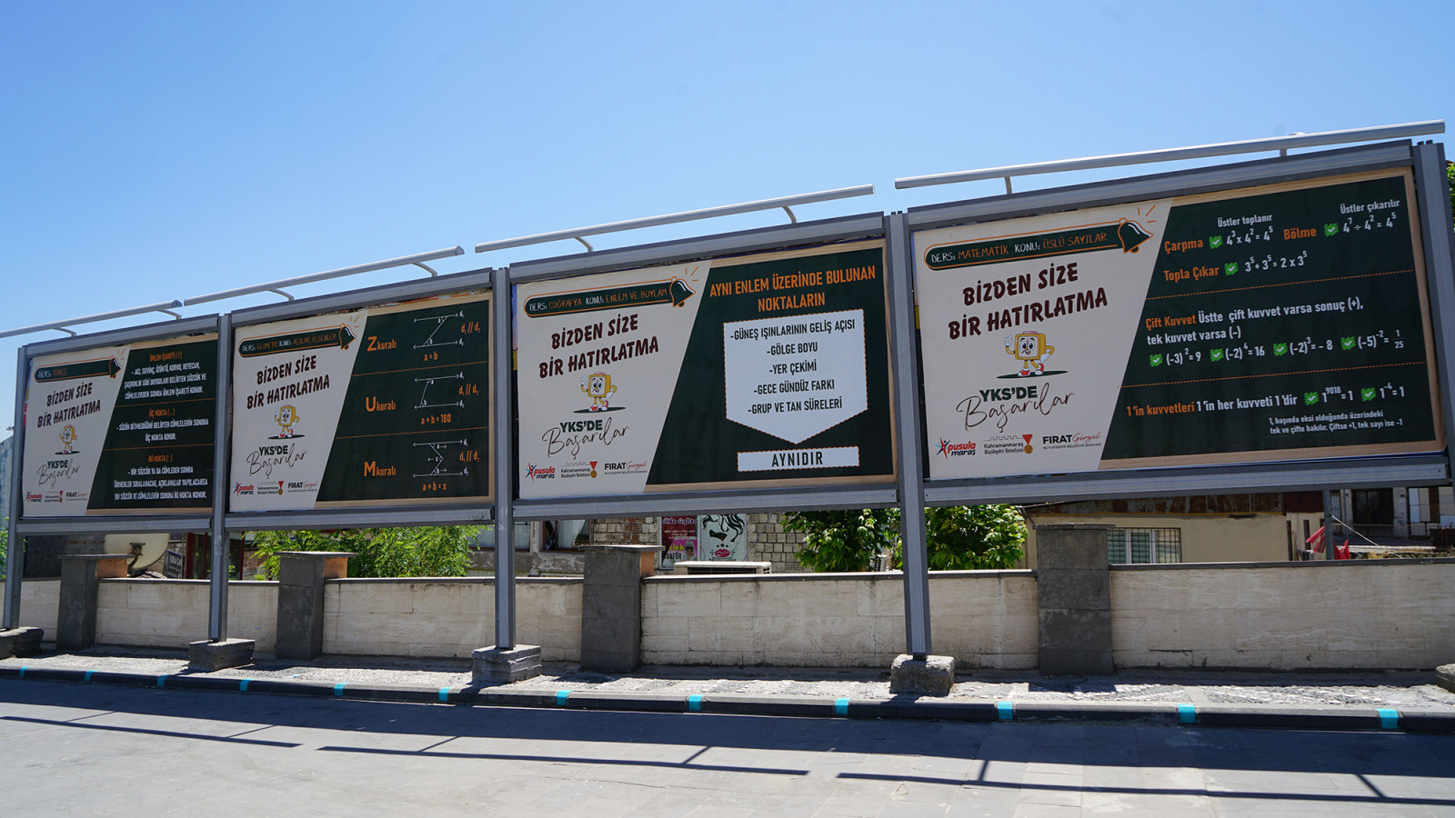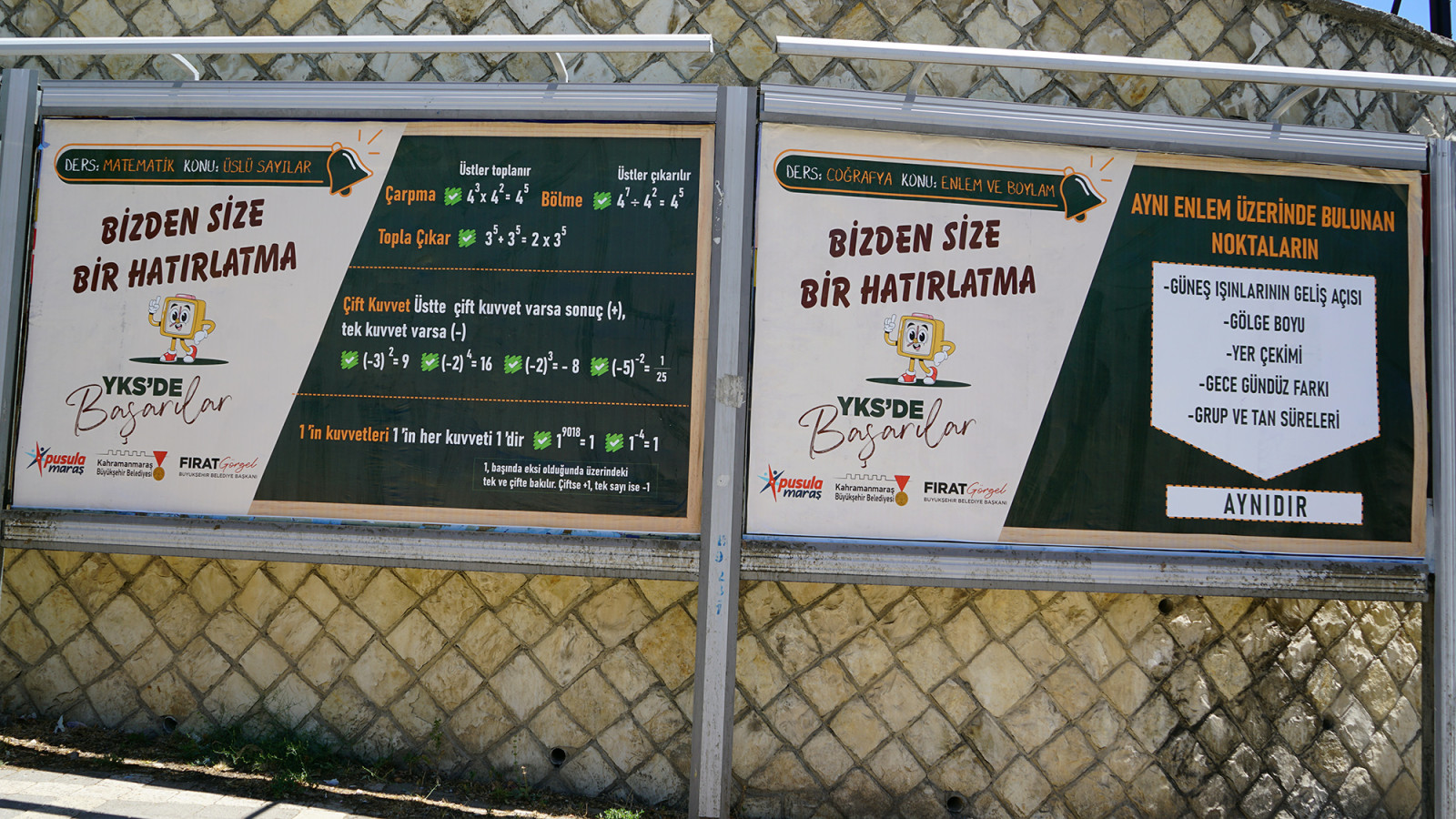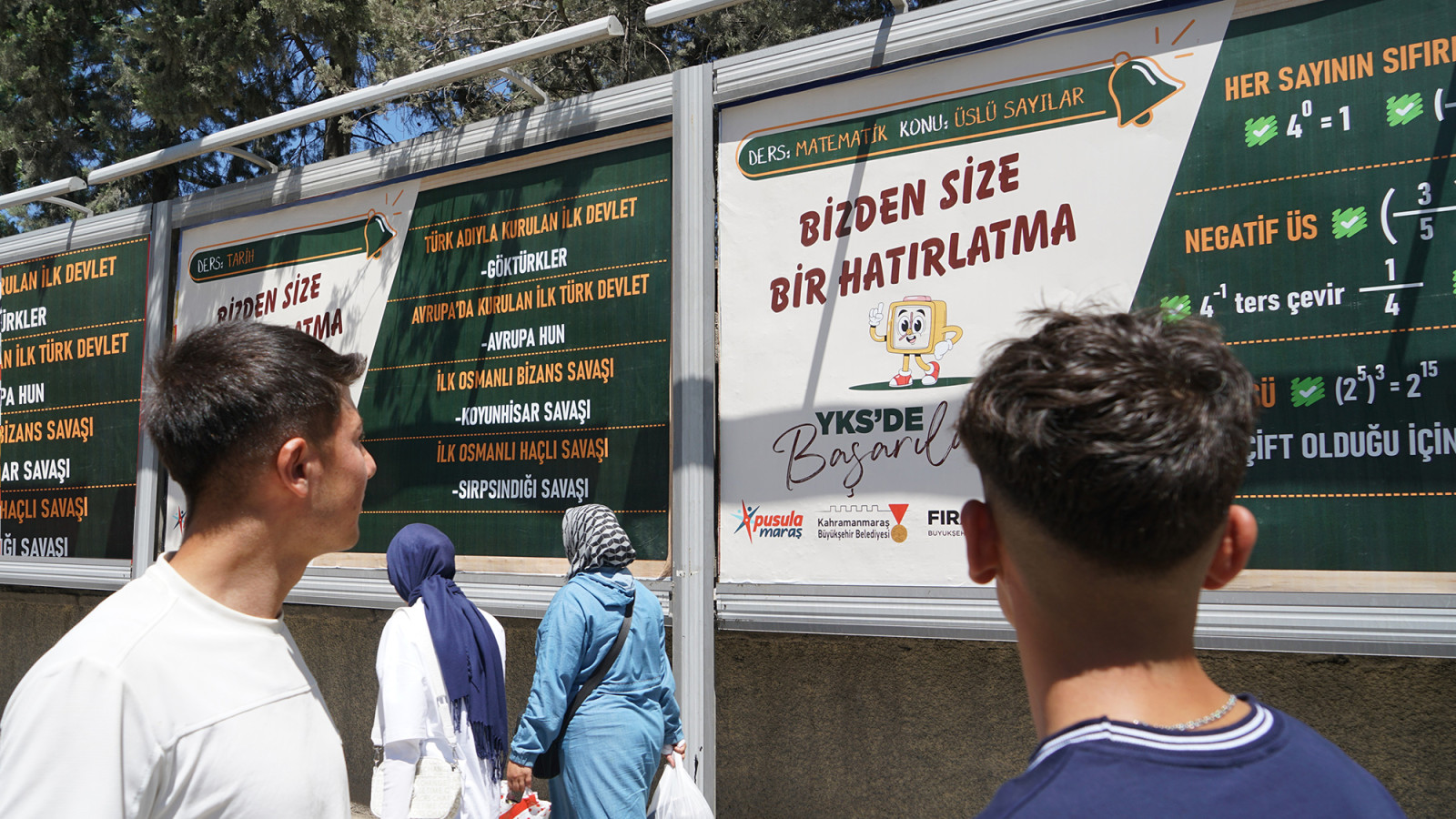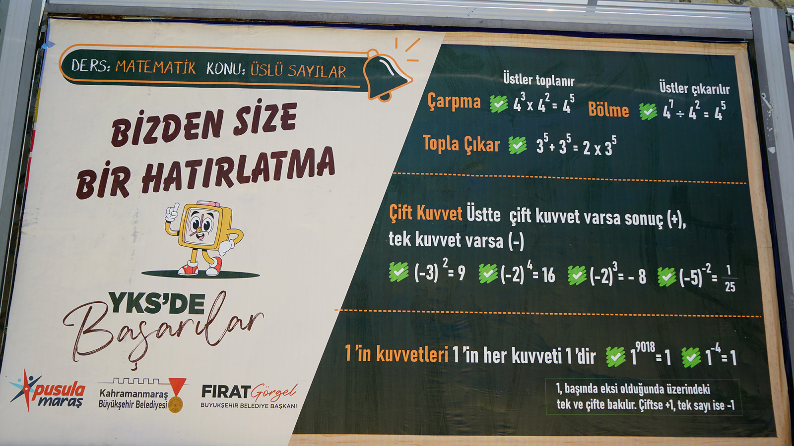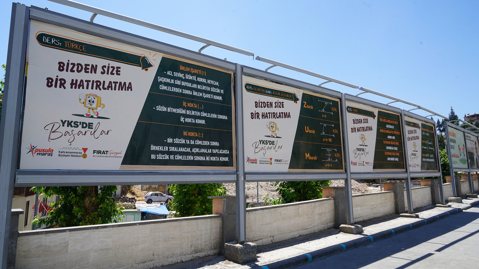 Eğitimden sanata, spordan kültüre geniş bir yelpazede sunduğu desteklerle gençlerin gelişimine ve potansiyellerini tam anlamıyla ortaya koymalarına olanak tanıyan Kahramanmaraş Büyükşehir Belediyesi, 21 ve 22 Haziran tarihlerinde gerçekleştirilecek Yükseköğretim Kurumları Sınavı (YKS) öncesi öğrencilerin son tekrarlarını keyifli hale getirmeleri için açık hava reklam alanlarını sınavlara yönelik kısa ve öz bilgi notlarıyla donattı. Türkçeden matematik ve fen bilimlerine, geometriden sosyal bilgilere kadar birçok dersten özenle seçilen kritik konu başlıkları, üniversite adaylarının günlük yaşamlarında sıklıkla karşılaştıkları noktalara yerleştirildi.