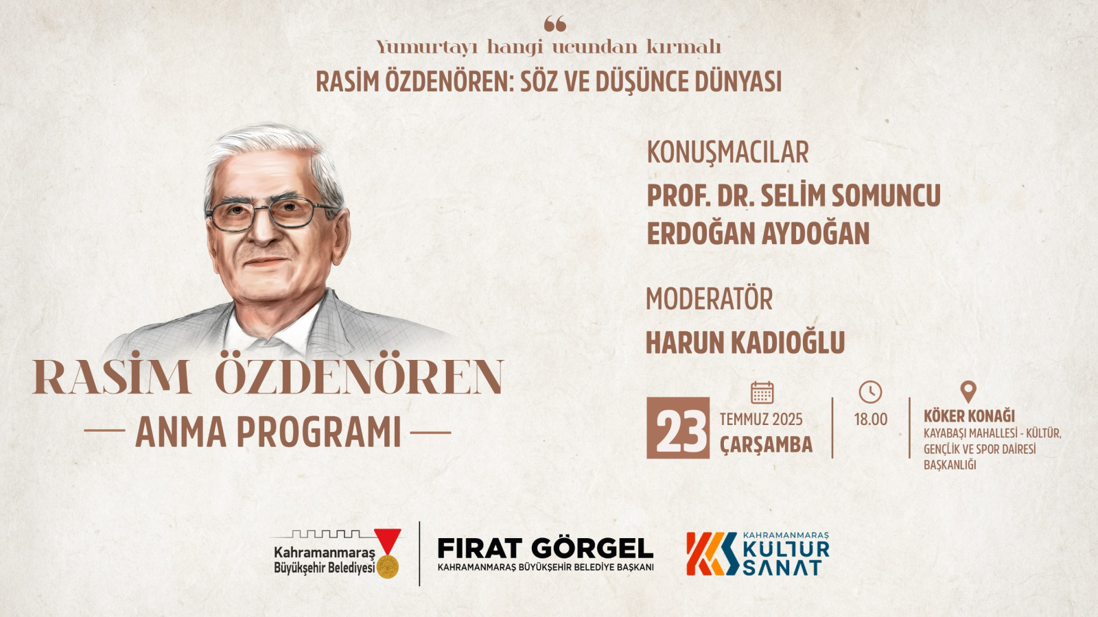 Kahramanmaraş Büyükşehir Belediyesi, şehrin zengin kültür ve sanat hayatına katkı sunmaya devam ediyor. Bu kapsamda, Yedi Güzel Adam’dan usta yazar Rasim Özdenören, vefatının üçüncü yılında özel bir program ile anılacak. Dulkadiroğlu Kayabaşı Mahallesi’nde bulunan Köker Konağı’nda gerçekleştirilecek olan anma programı, 23 Temmuz Çarşamba günü saat 18.00’da başlayacak. Harun Kadıoğlu’nun moderatörlüğünde gerçekleştirilecek anma programında KSÜ öğretim üyesi Prof. Dr. Selim Somuncu ve yazar Erdoğan Aydoğan, Türk Edebiyatı’nın dev ismi Rasim Özdenören’in edebi kişiliğini anlatacak. Büyükşehir Belediyesi tarafından yapılan açıklamada, Türk Edebiyatı’nın köşe taşlarından Rasim Özdenören’i anma programına tüm vatandaşların davetli olduğu belirtildi.