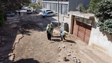 KASKİ, Dulkadiroğlu’nun Menderes Mahallesinde altyapı imalatlarının ardından yol yüzeyinde oluşan bozulmaların giderilmesi için kilit parke döşeme çalışması gerçekleştiriyor.