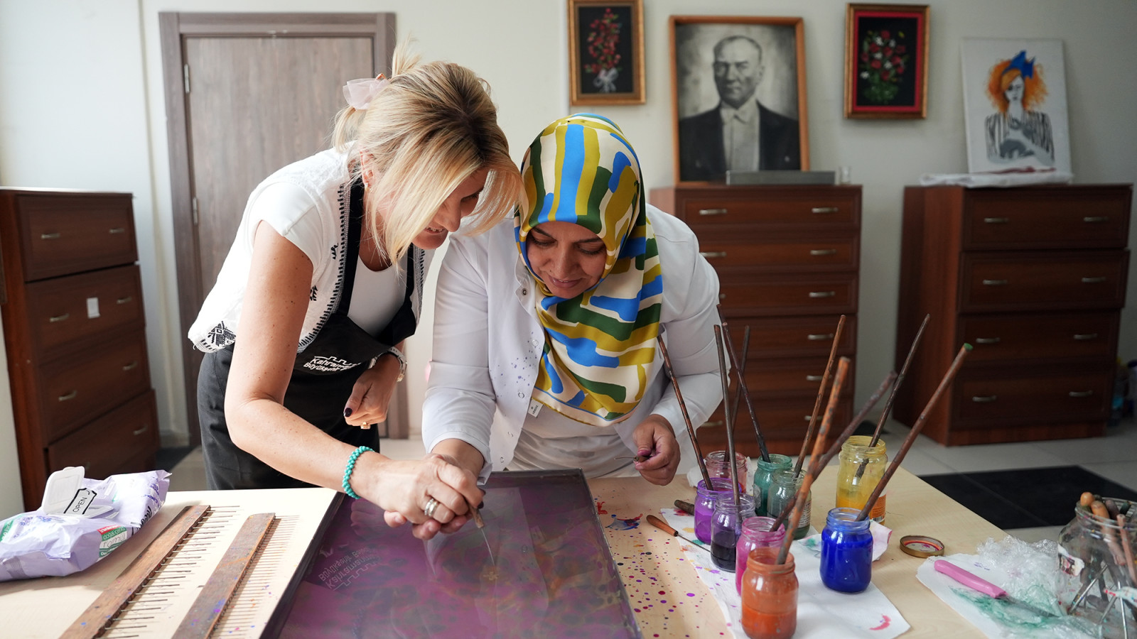 Kahramanmaraş Büyükşehir Belediyesinin Meslek Edindirme Kursları (KAMEK), uluslararası bir ziyarete ev sahipliği yaptı. Erasmus programı kapsamında İtalya, Letonya ve Polonya’dan Kahramanmaraş’a gelen öğrenciler, KAMEK bünyesinde düzenlenen kursları yakından görme ve deneyimleme fırsatı buldu. Ziyaret kapsamında KAMEK’te yürütülen eğitimler hakkında bilgi alan öğrenciler, özellikle ebru ve süs eşyası yapım atölyelerinde uygulamalı çalışmalar gerçekleştirdi. Ortaya çıkan renkli görüntüler, öğrencilerin hem eğlenmesini hem de Türk kültürüne dair yeni deneyimler kazanmasını sağladı.