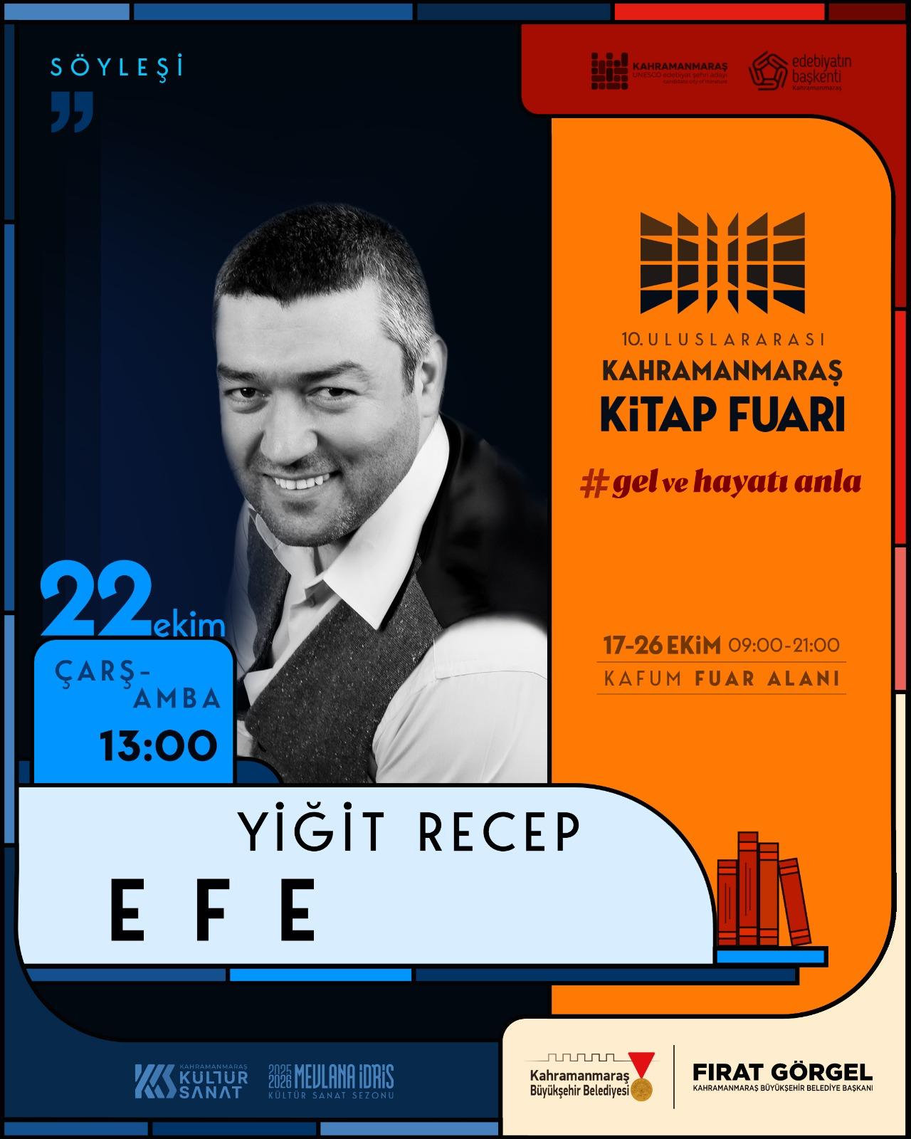 22 Ekim Çarşamba günü saat 13.00’da çocuklara yönelik yazdığı tarih kitapları ile tanınan yazar Yiğit Recep Efe, okurları ile bir araya gelecek. Efe, tarihi anlatım gücüyle genç zihinlere ilham verecek. Aynı gün, "Körün Parmak Uçları", "Mara ve Öteki Şiirler" ile "Kağıda Sarılı Rüzgar"ın da aralarında bulunduğu çok sayıda esere imza atan şair ve yazar Abdurrahim Ali Ural, saat 15.00’da edebiyatseverlerle şiirin derinliklerini söyleşi programında ele alacak. Saat 16.00’da ise çocuk kitap yazarı Melih Tuğtağ, söyleşi salonunda sevenleri ile bir araya gelecek. Günün son programında ise Klinik Psikolog Mehmet Teber sahne alacak. Çocuklara yönelik kaleme aldığı kitaplarla tanınan teber, hem ebeveynlere hem de çocuklara önemli bilgiler paylaşacak. Büyükşehir Belediyesinden yapılan açıklamada, 10. Uluslararası Kahramanmaraş Kitap Fuarı’nın altıncı gününde gerçekleştirilecek programlara tüm vatandaşların davetli olduğu belirtildi.