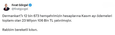 Kahramanmaraş Büyükşehir Belediyesi, sosyal belediyecilik anlayışını sahada somut adımlarla hayata geçirmeye devam ediyor. İhtiyaç sahibi vatandaşların yaşam kalitesini artırmayı ve Başkan Fırat Görgel öncülüğünde insanı merkeze alan yönetim anlayışı ile Türkiye’ye örnek belediyecilik anlayışı sergileyen Büyükşehir Belediyesi, Dermankart sahibi vatandaşlara da aylık nakdi destek sağlıyor. Bu kapsamda, 12 bin 673 Dermankart kullanıcısına Kasım ayı ödemeleri yapıldı. Büyükşehir Belediye Başkanı Fırat Görgel, “Dermankart’lı 12 bin 673 hemşehrimizin hesaplarına Kasım ayı ödemeleri toplamı olan 23 Milyon 106 Bin TL yatırılmıştır. Rabbim bereketli kılsın” ifadelerini kullandı.