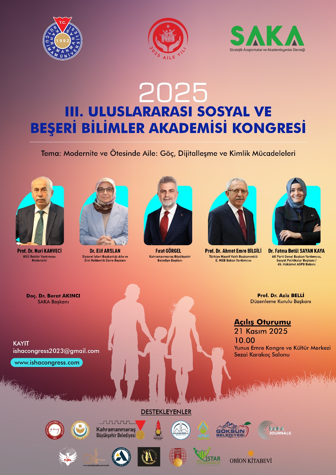 Kahramanmaraş Büyükşehir Belediyesi, 2025 Aile Yılı kapsamında aile kurumunun güçlendirilmesi ve toplumsal farkındalığın artırılması amacıyla yürüttüğü çalışmalara bir yenisini daha ekliyor. Bu çerçevede, Kahramanmaraş Sütçü İmam Üniversitesi ve Stratejik Araştırmalar ve Akademisyenler Derneği (SAKA) öncülüğünde düzenlenecek “Modernite ve Ötesinde Aile: Göç, Dijitalleşme ve Kimlik Mücadeleleri” temalı 3. Uluslararası Sosyal ve Beşerî Bilimler Akademisi Kongresi, birbirinden değerli isimleri vatandaşlarla buluşturacak. Kongrenin açılış programı, 21 Kasım Cuma günü KSÜ Yunus Emre Kongre ve Kültür Merkezi Sezai Karakoç Salonu’nda gerçekleştirilecek. Saat 10.00’da başlayacak açılış oturumunun moderatörlüğünü KSÜ Rektör Yardımcısı Prof. Dr. Nuri Kahveci üstlenecek. Açılışta Büyükşehir Belediye Başkanı Fırat Görgel’in yanı sıra; AK Parti Sosyal Politikalardan Sorumlu Genel Başkan Yardımcısı Dr. Fatma Betül Sayan Kaya, Diyanet İşleri Başkanlığı Aile ve Dini Rehberlik Daire Başkanı Dr. Elif Arslan, Türkiye Maarif Vakfı Başkanvekili Prof. Dr. Ahmet Emre Bilgin, SAKA Başkanı Doç. Dr. Berat Akıncı ve Düzenleme Kurulu Başkanı Prof. Dr. Aziz Belli, katılımcılara hitap edecek.