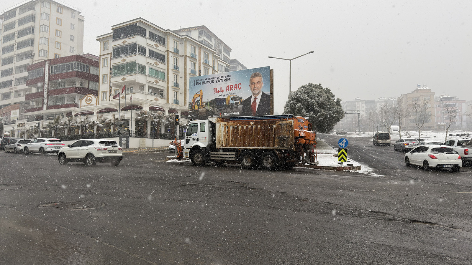 Büyükşehir Belediyesi, şehir genelinde yeniden etkili olan kar yağışının ulaşımı ve günlük yaşamı olumsuz etkilememesi için görev başında. Ekipler, şehir merkezinde de kritik noktalarda yerini aldı.