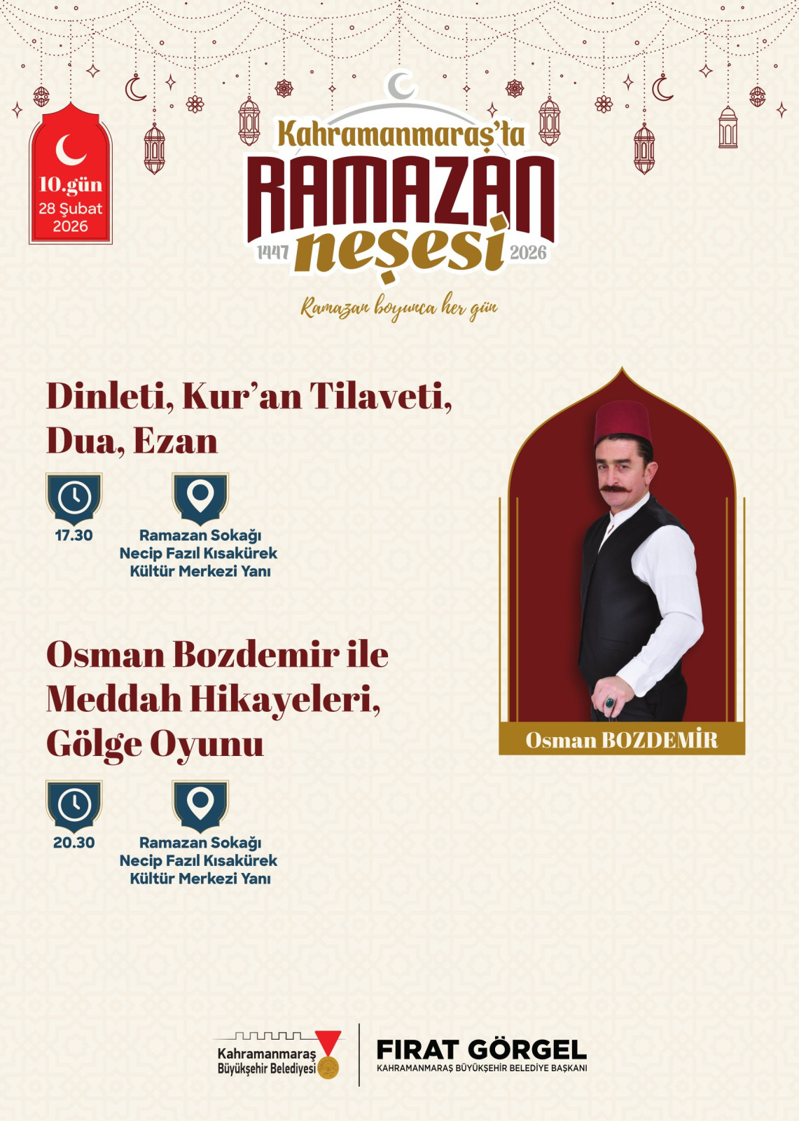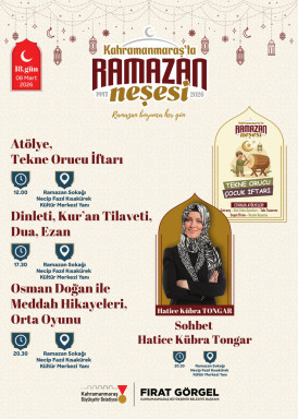 Ramazan ayının manevi iklimini şehir genelinde hissettirmek ve her yaştan vatandaşı kültür ile sanatla buluşturmak amacıyla Kahramanmaraş Büyükşehir Belediyesi, dolu dolu bir etkinlik takvimi hazırladı. Ay boyunca çocuklardan yetişkinlere kadar geniş bir kesime hitap edecek programlarla Ramazan’ın huzuru; tiyatrodan söyleşiye, ilahi dinletilerinden atölye çalışmalarına kadar birçok başlık altında yaşatılacak. Etkinliklerin merkezi, Necip Fazıl Kısakürek Kültür Merkezi yanında oluşturulan Ramazan Sokağı olacak. Ramazan ayı boyunca her gün vatandaşların buluşma noktası haline gelecek alanda, manevi atmosferi güçlendiren programlar aralıksız devam edecek.