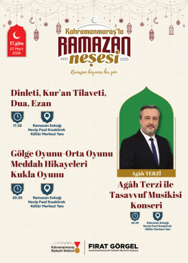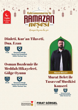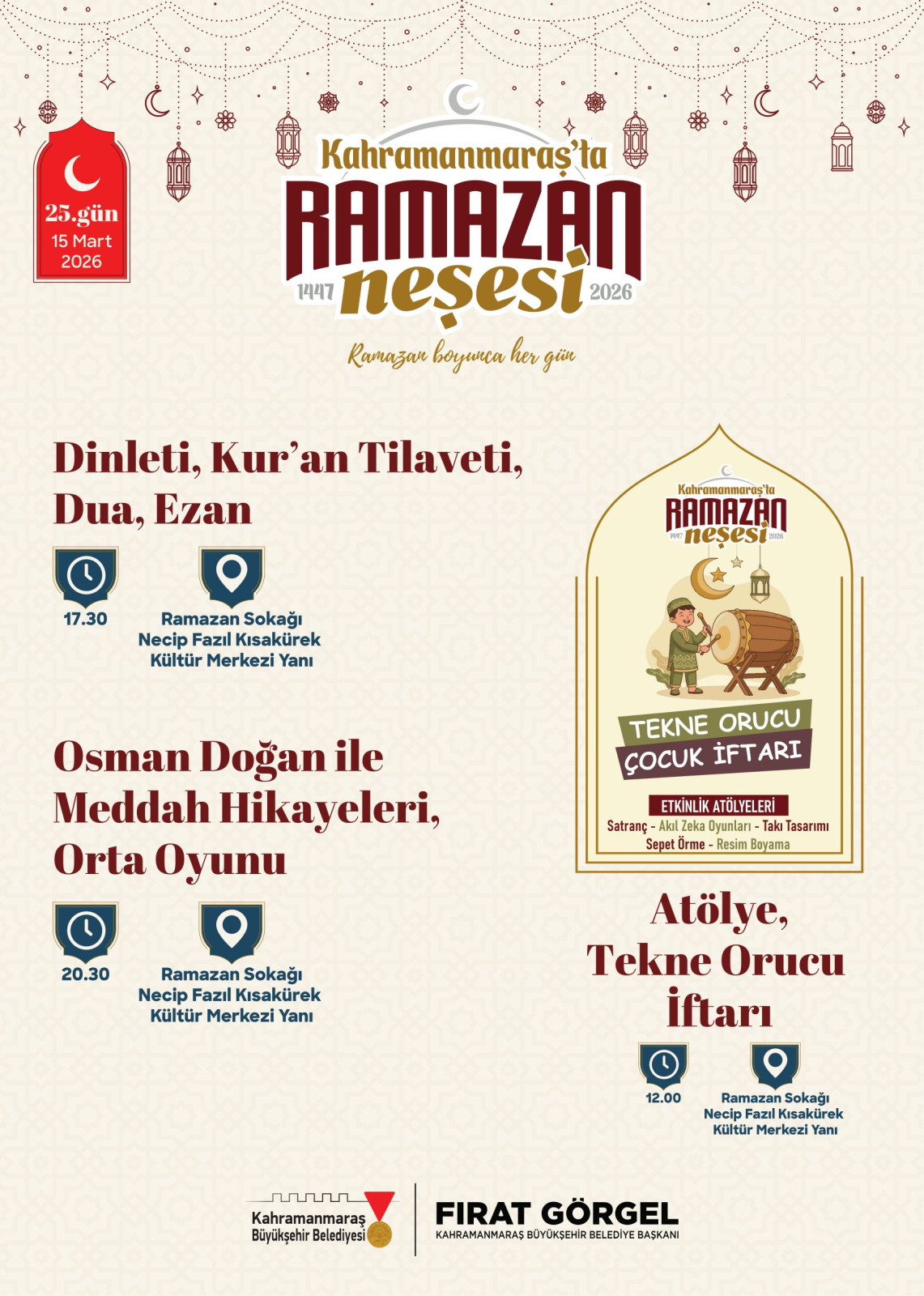 Büyükşehir Belediyesi tarafından yapılan açıklamada, Ramazan ayı boyunca gerçekleştirilecek tüm etkinliklerin ücretsiz olduğu ve vatandaşların programlara davetli olduğu ifade edildi. Etkinlik takvimine https://kahramanmaras.bel.tr/duyuru/2026/02/17/ramazan-ayi-etkinlik-takvimi internet adresi üzerinden ulaşılabileceği belirtilirken, Ramazan Sokağı’nın bu yıl şehrin manevi buluşma noktası olması hedefleniyor. Sanat, kültür ve maneviyatın iç içe geçtiği Ramazan programlarıyla Kahramanmaraş’ta Ramazan akşamlarının dolu dolu geçmesi planlanıyor.