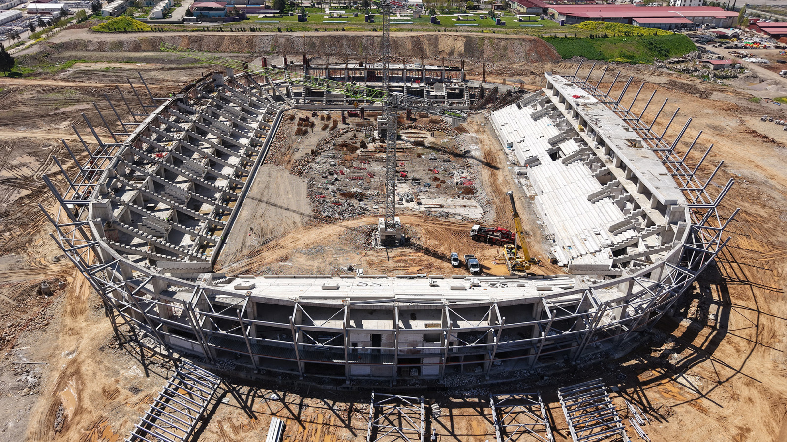 Dulkadiroğlu İstasyon Mahallesi’nde hayata geçirilen Yeni Kahramanmaraş Stadyumu’nun inşası hızla devam ediyor. Taşıyıcı sistemler büyük ölçüde tamamlanırken, ekipler eş zamanlı olarak çelik ve çatı imalatlarını gerçekleştiriyor.