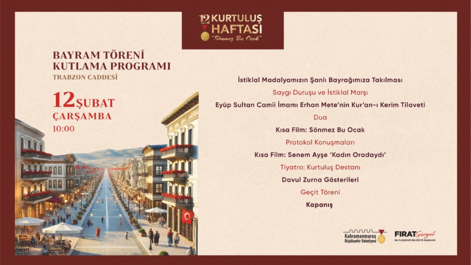 Şehrin düşman işgalinden kurtuluşunun 105. yıl dönümü dolayısıyla gerçekleştirilen etkinlikler 10, 11 ve 12 Şubat tarihlerinde vatandaşlarla buluşmaya devam edecek. Anma törenleri, konferanslar, tiyatro gösterileri ve kortej yürüyüşleri gibi çeşitli programlarla, Kahramanmaraş’ın kurtuluşunun 105. yılı kutlanacak. Kurtuluş coşkusuna tüm vatandaşlar davet edildi.