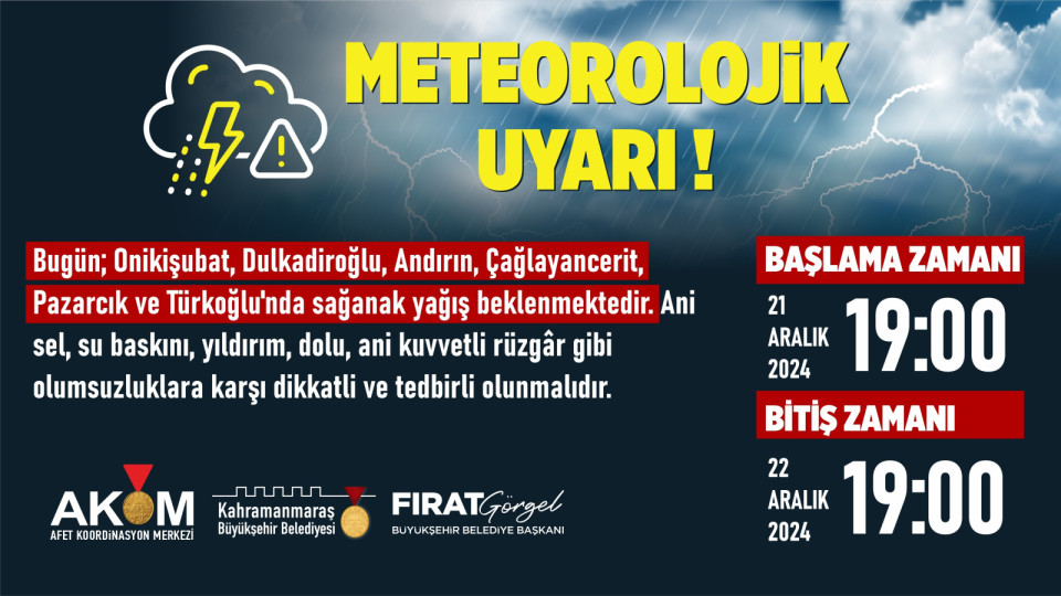 Afet Koordinasyon Merkezi; Onikişubat, Dulkadiroğlu, Andırın, Çağlayancerit, Pazarcık ve Türkoğlu’nda bugün akşam saatlerinden itibaren sağanak yağış beklendiğini duyurdu. Tüm tedbirlerin alındığı ve ekiplerin teyakkuzda olduğu belirtilirken, meydana gelebilecek olumsuzluklara karşı vatandaşlar uyarıldı.