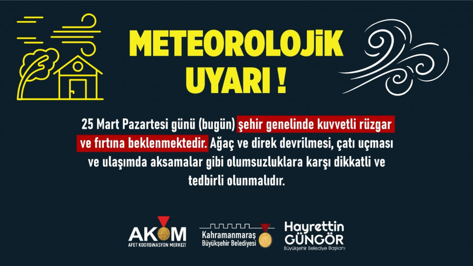 Büyükşehir Belediyesi Afet Koordinasyon Merkezi, 25 Mart Pazartesi günü (bugün) şehir genelinde kuvvetli rüzgâr ve fırtına beklendiğini duyurarak dikkatli ve tedbirli olunması noktasında vatandaşları uyardı.
